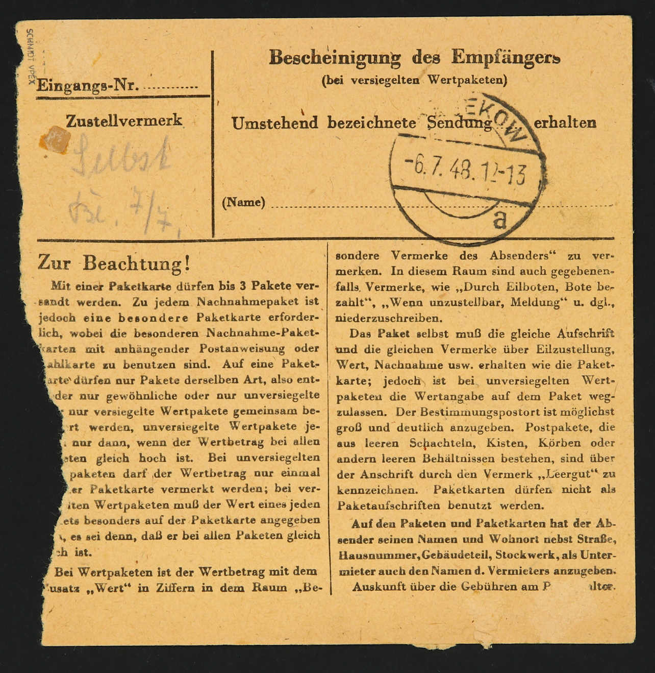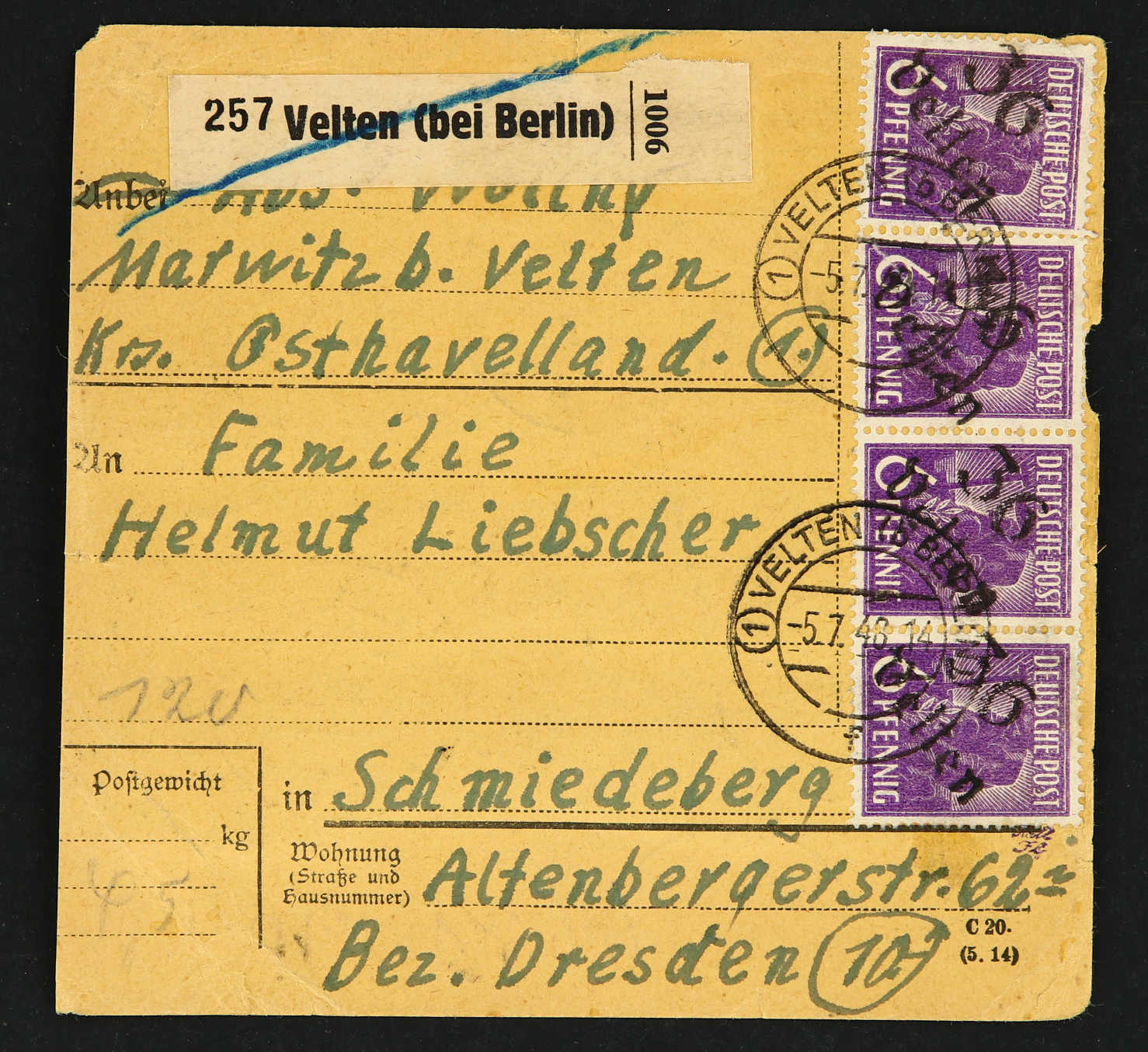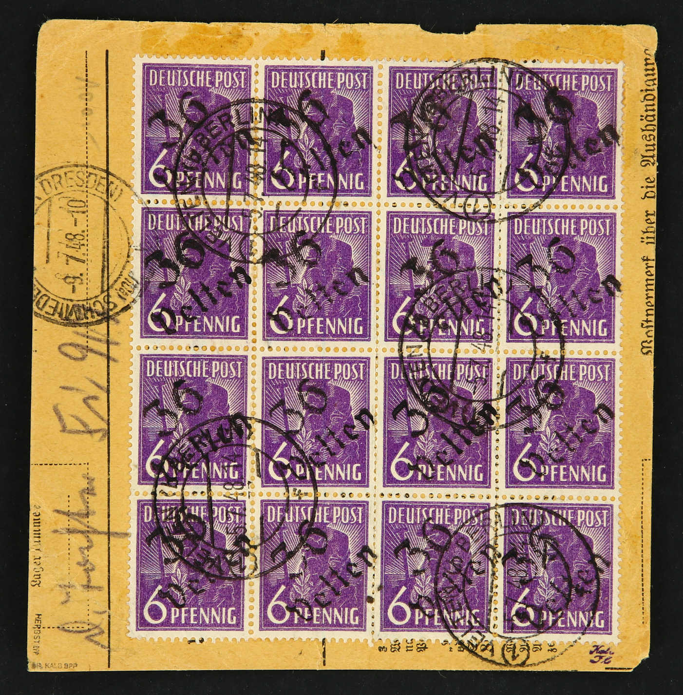1948, 6 Pfg. Pflanzer mit Bezirksstempel "36 Velten" 20mal vorder- und rückseitig auf Paketkarte ab "VELTEN 5.7.48" nach Schmiedeberg, reine Mehrfachfrankatur, Ecken etwas bügig, sonst gute Bedarfsqualität, geprüft Dr. Kalb BPP (Image) (imagea)