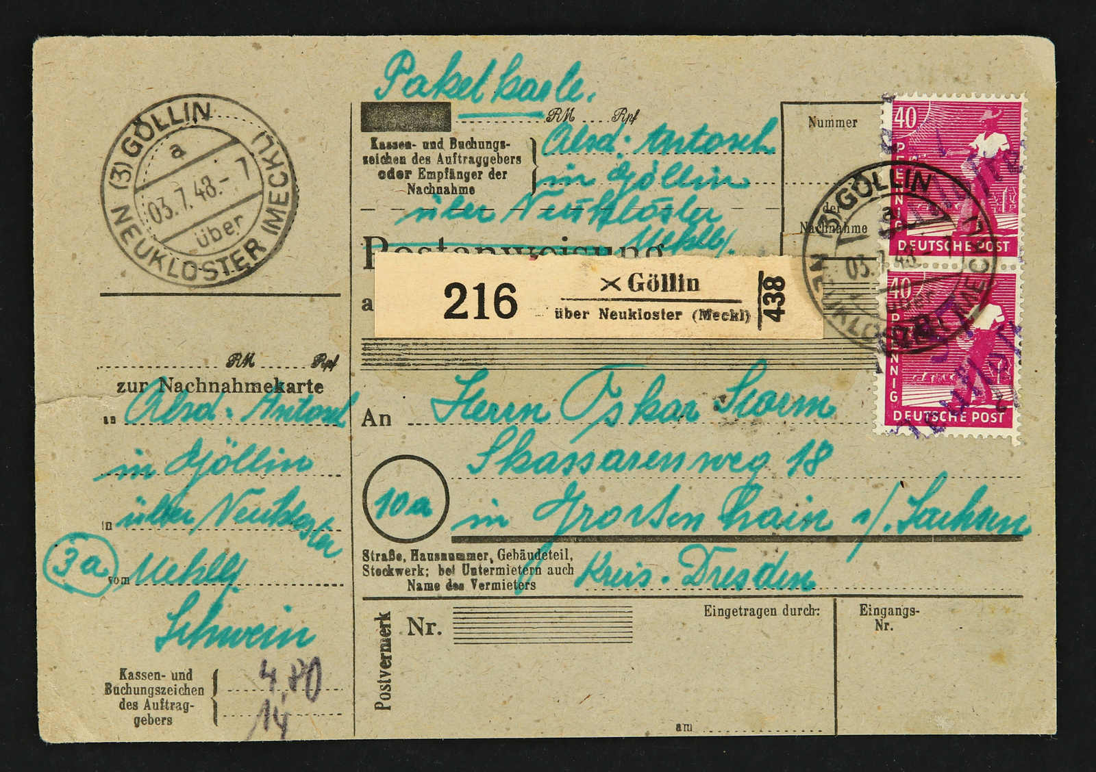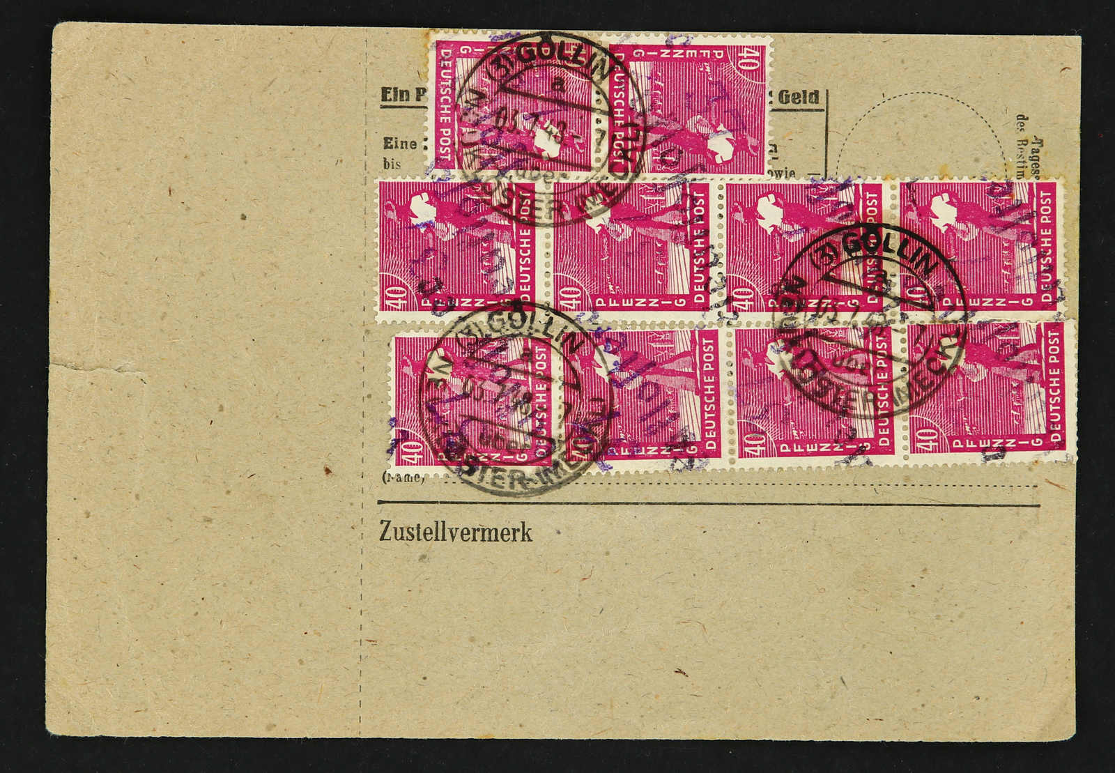 1948, 40 Pfg. Sämann mit Bezirksstempel "37 Neukloster" in violettschwarzer Mischfarbe 12mal vorder- und rückseitig auf Paketkarte (Postanweisungsformular) ab "GÖLLIN über NEUKLOSTER 3.7.48" nach Großenhain, reine Mehrfachfrankatur, eine