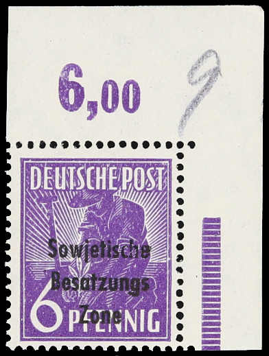 1948, 6 Pfg. Maschinenaufdruck schwärzlichbläulichviolett, postfrisches Exemplar aus der oberen rechten Bogenecke mit nicht durchgezähntem Oberrand, einwandfrei und unsigniert, als Oberrandstück bislang nur ganz wenige Stücke bekannt!