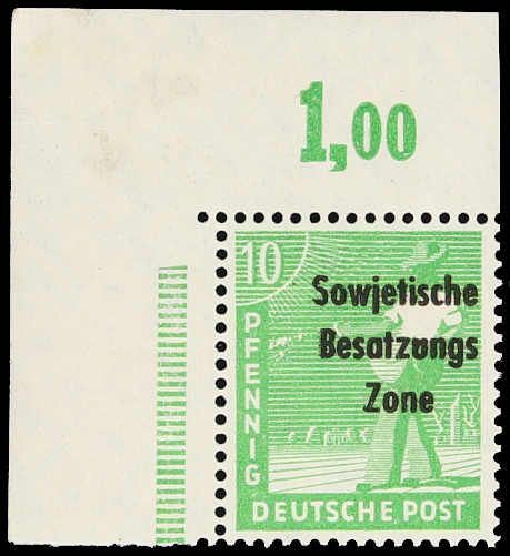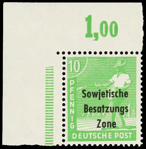 1948, 10 Pfg. Maschinenaufdruck gelblichgrün, postfrisches Exemplar aus der linken oberen Bogenecke mit nicht durchgezähntem Oberrand, einwandfrei und unsigniert, Fotobefund Dr. Ruscher BPP 10/2024 (ME 400,-) (Image) (imagea)