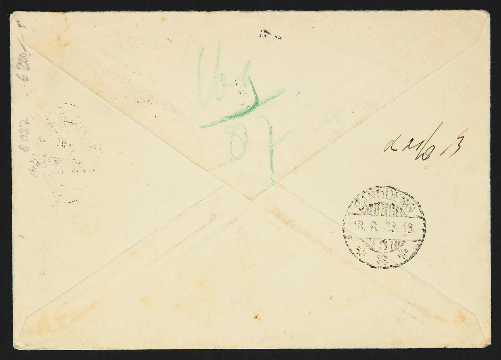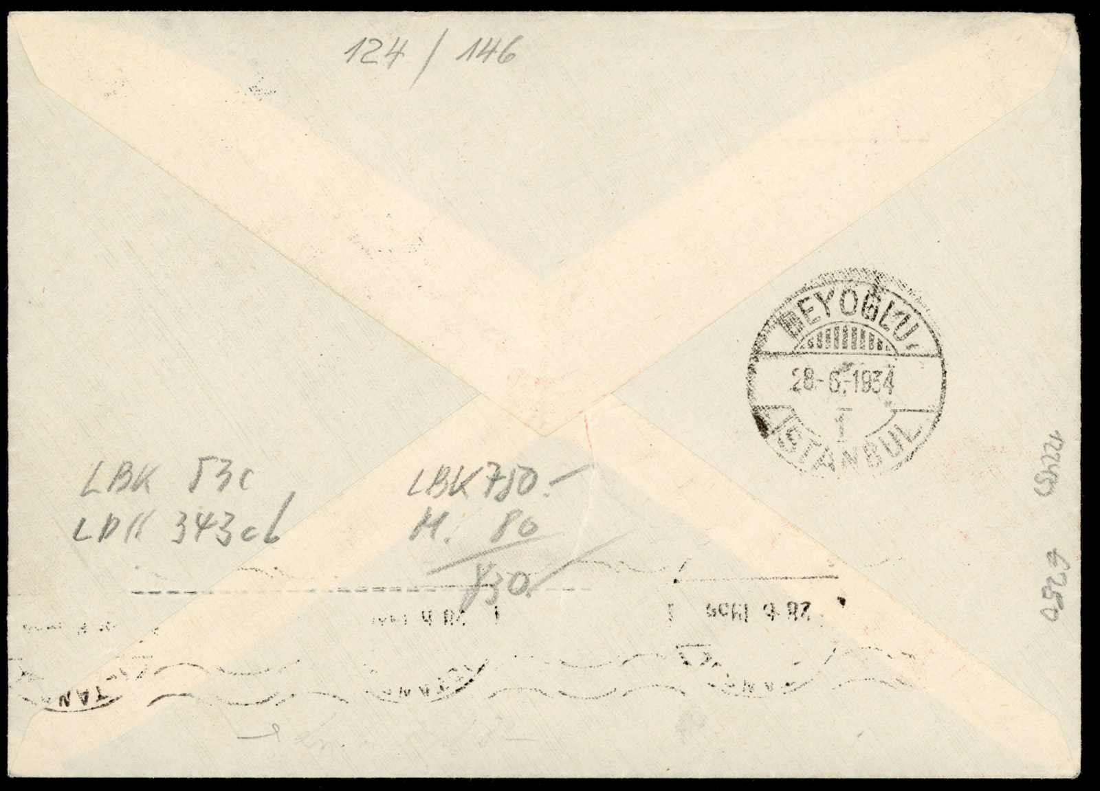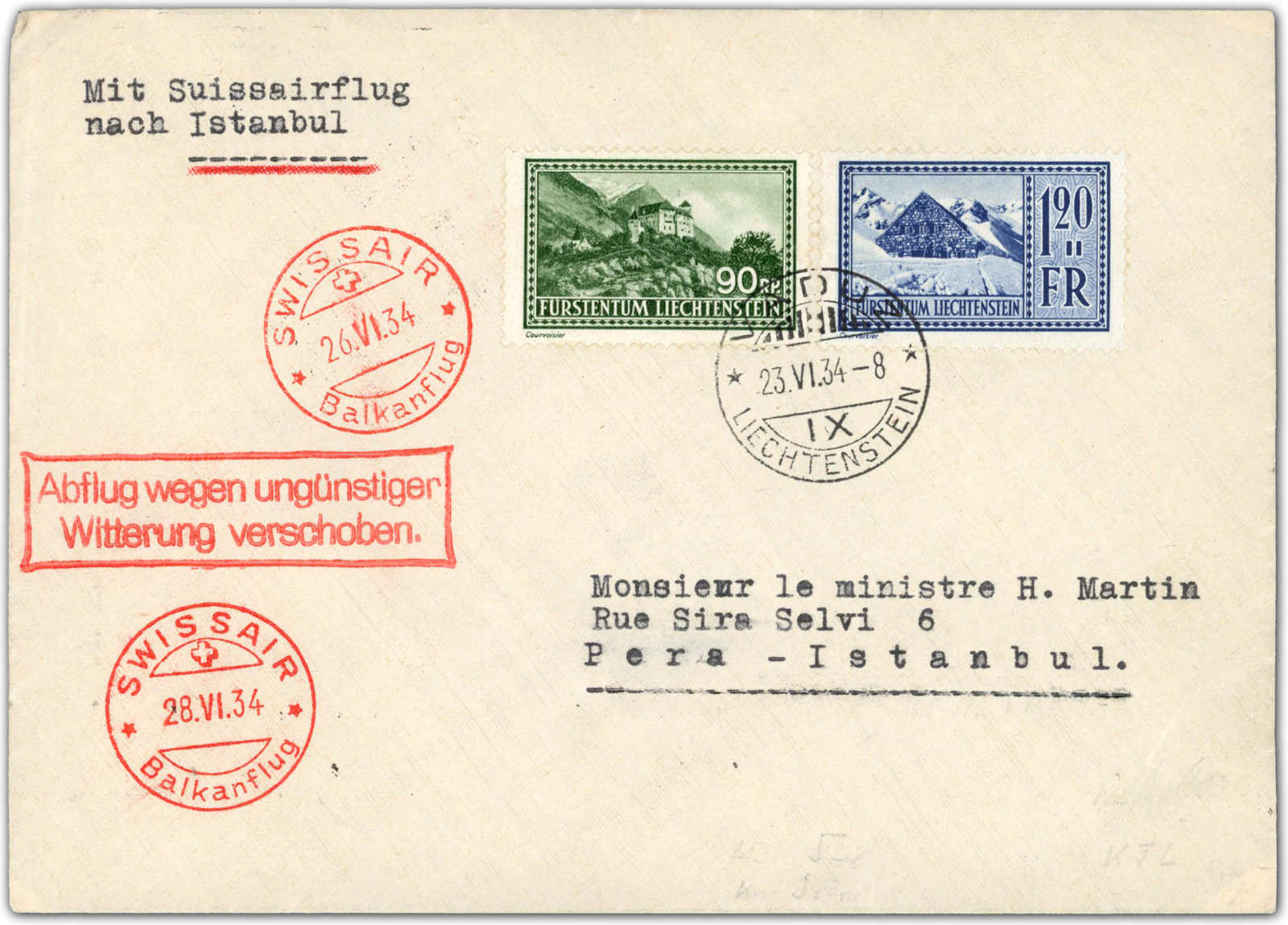 1934, SWISSAIR Balkanflug, Etappe Zürich - Istanbul, Brief ab Vaduz 23.4.34 mit rotem Flugbestätigungsstempel vom 26.6. nach Beyoglu 28.6., SLH: SF 34.3 cL