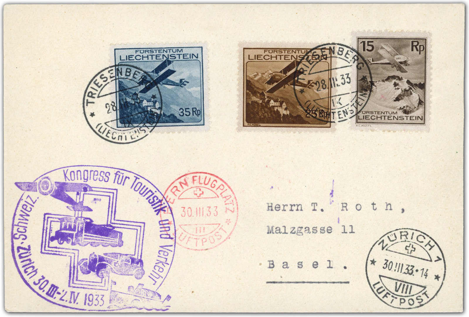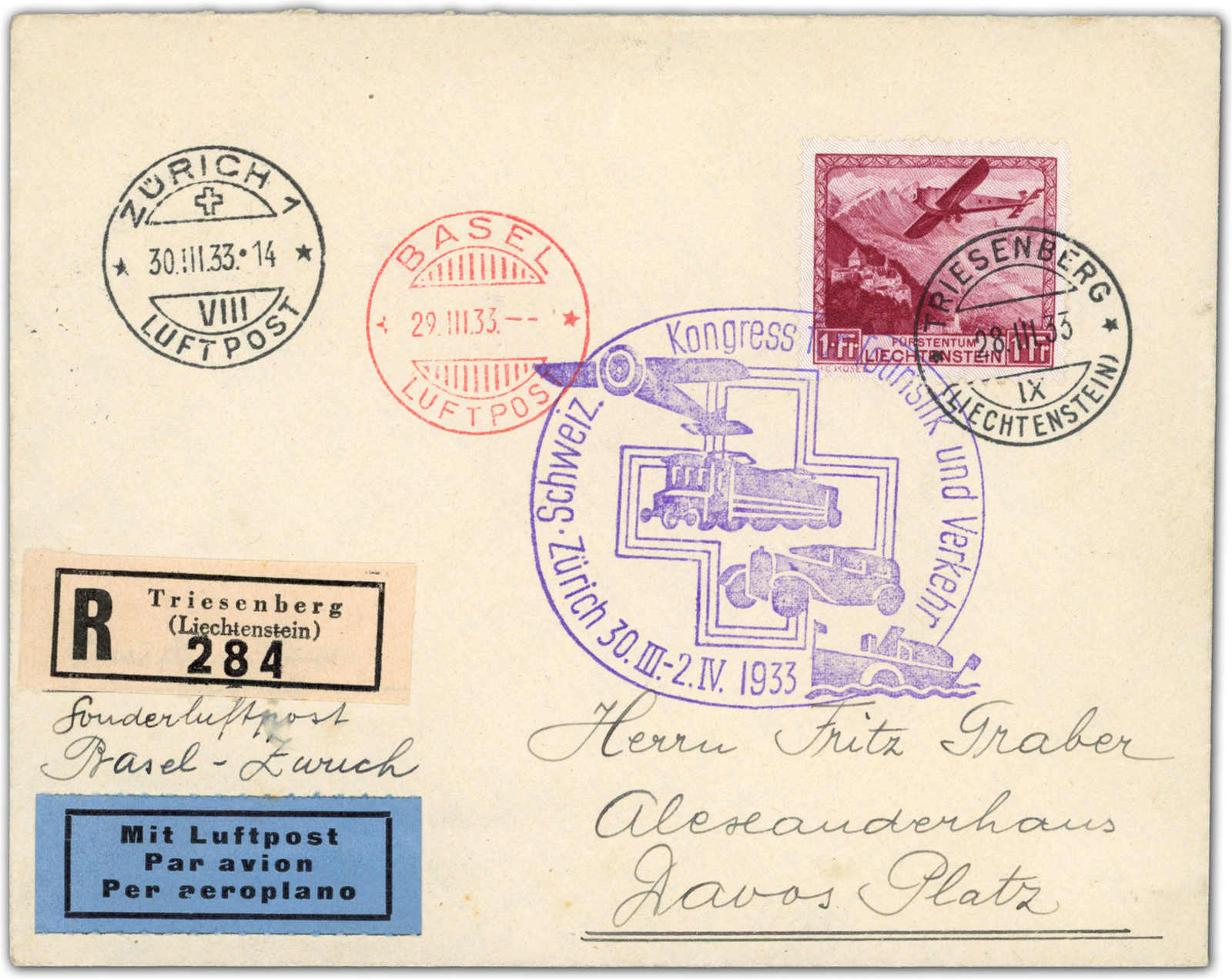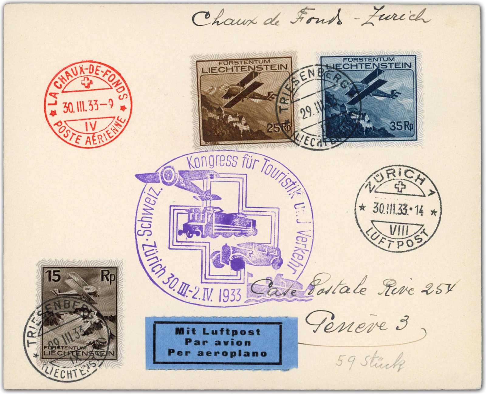 1933, Tourismus- und Verkehrskongress, Brief ab Triesenberg 29.3.33 via Le Locle 30.3. nach Zürich 30.3., adressiert nach Genf, SLH: SF 33 c FL