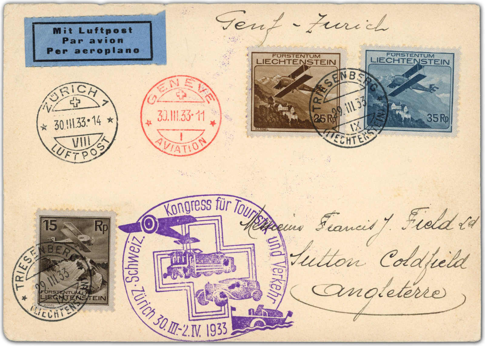 1933, Tourismus- und Verkehrskongress, Brief ab Triesenberg 29.3.33 via Genf 30.3. nach Zürich 30.3., adressiert nach Sutton Coldfield, England, SLH: SF 33 e FL (Image) (imagea)