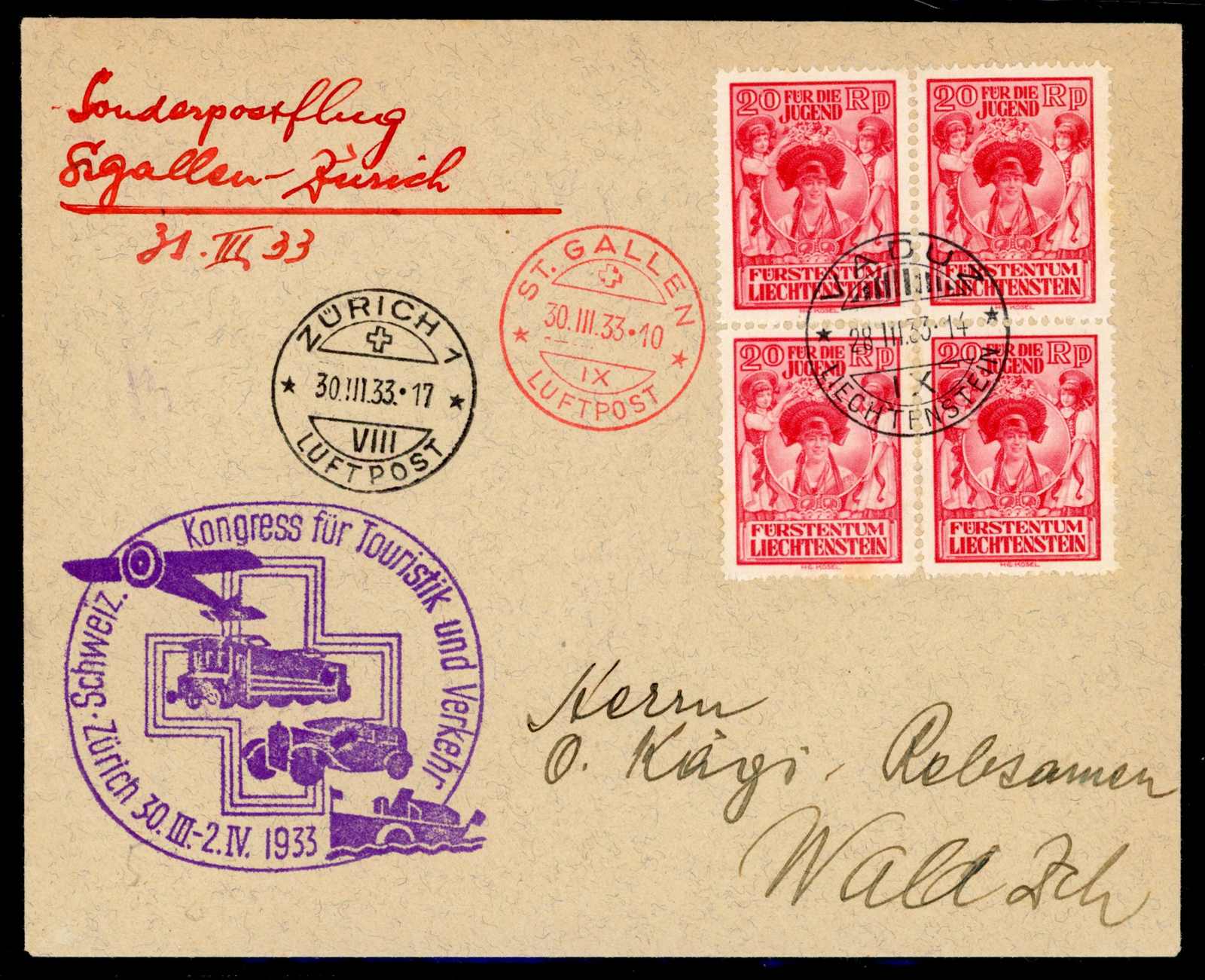 1933, Tourismus- und Verkehrskongress, Brief ab Vaduz 28.3.33 via St. Gallen 30.3. nach Zürich 30.3., adressiert nach Wald, SLH: SF 33 g FL