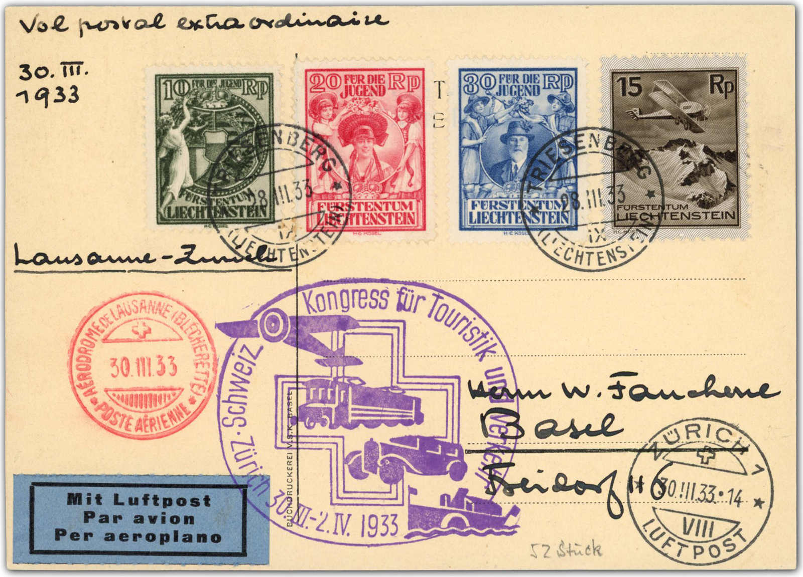 1933, Tourismus- und Verkehrskongress, Fotokarte ab Triesenberg 28.3.33 via Lausanne 30.3. nach Zürich 30.3., adressiert nach Basel, SLH: SF 33 d FL