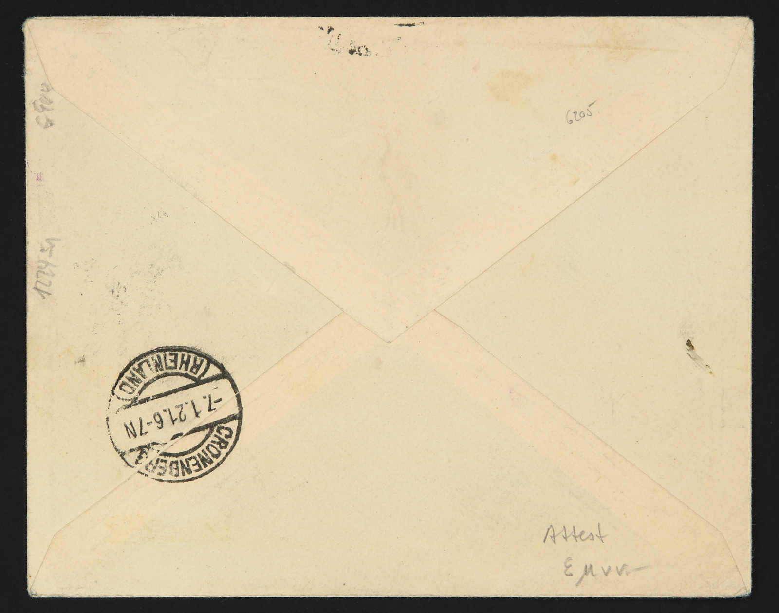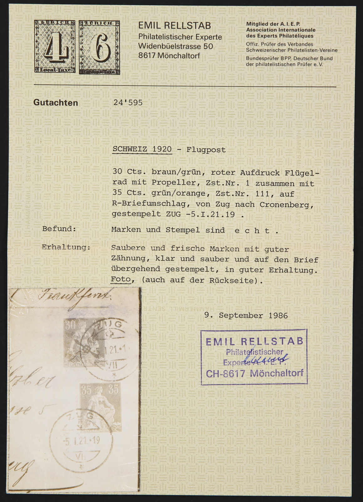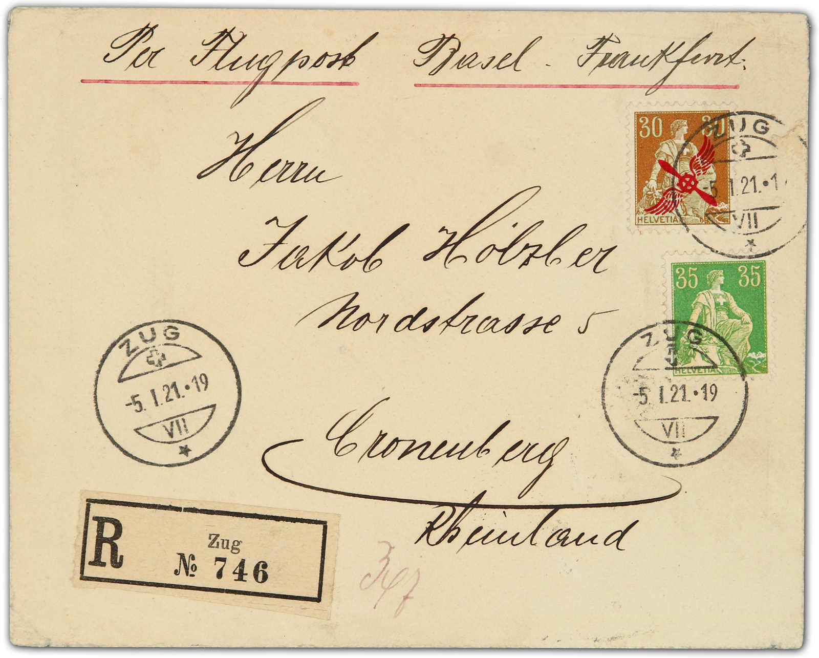 1919, R-LP-Brief ab Zug 5.1.21 frankiert mit 30 Rp. Flugpostmarke und 35 Rp. Sitzende Helvetia via Basel nach Cronenberg / Rheinland 7.1., kein Flugverkehr, der Brief wurde daher mit der Bahn befördert, Gutachten Rellstab AIEP, SLH 20.1