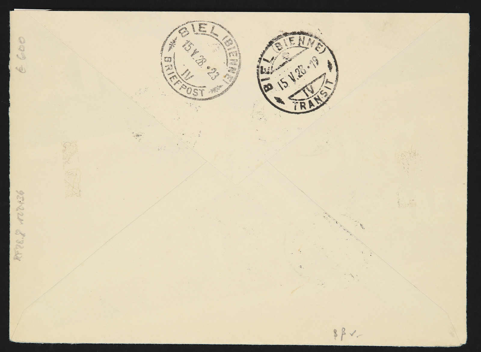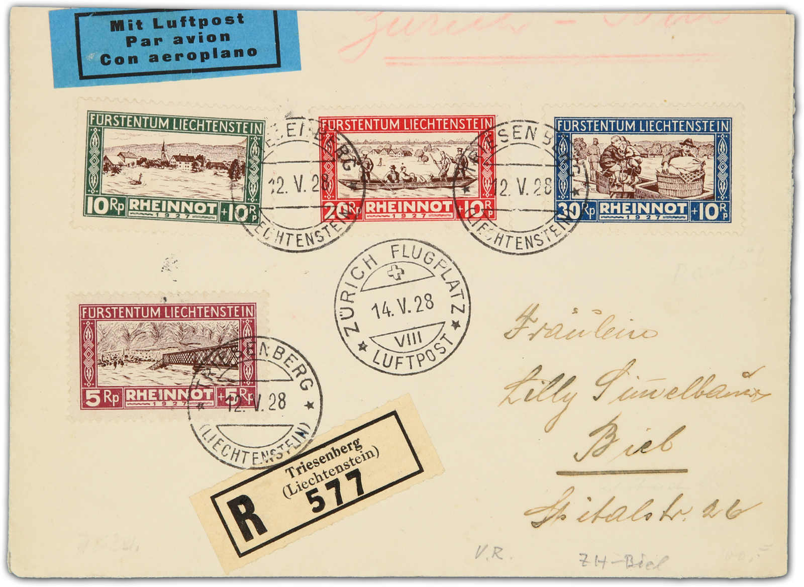 1928, Erstflug Zürich - Biel, Brief mit Satzfrankatur Rheinnot (10 Rp. links Zahnverkürzungen) ab Triesenberg 12.5.1928 via Zürich 14.5. nach Biel 15.5., nur 10 Stück ab Liechtenstein bekannt, SLH EF 28.8 dL (Image) (imagea)