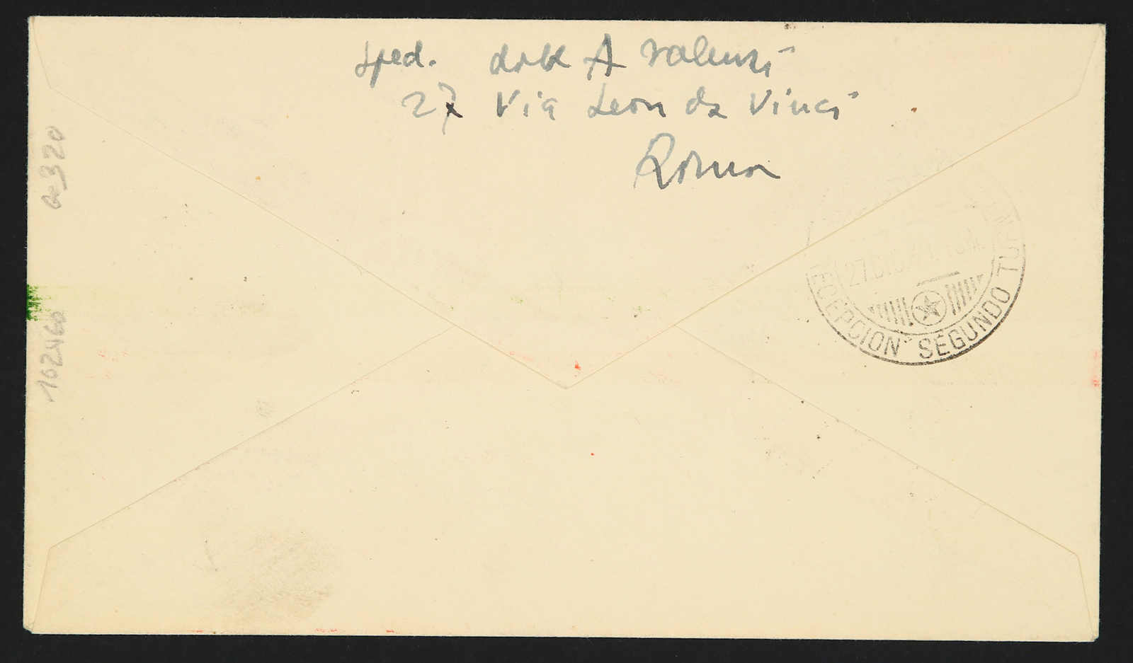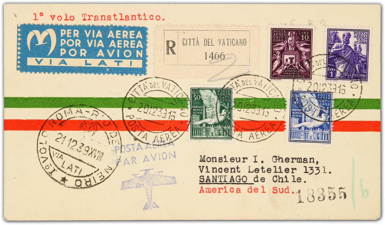 1939, Erstflug LATI Rom - Rio de Janeiro, R-Brief ab Citta del Vaticano 20.12.39 mit Erstlug-Sonderstempel "ROMA - RIO" vom 21.12. nach Santiago de Chile 27.12., seltene Variante (Image) (imagea)