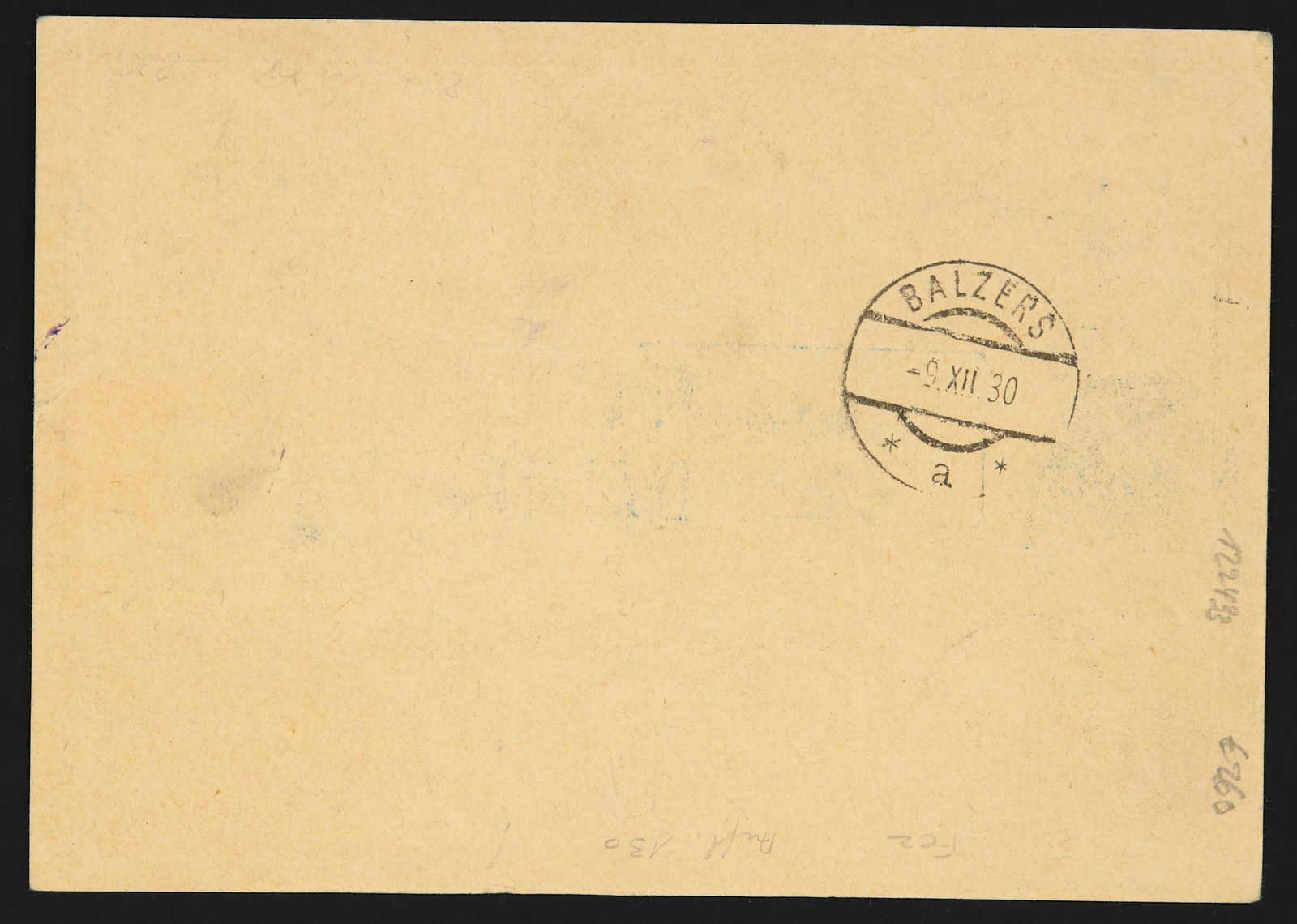 1930, III. Schweizer Afrikaflug, Etappe Zürich - Fez, GA-Karte mit herrlicher Zusazfrankatur ab Balzers 25.11.29 via Zürich nach Fez 4.12., adressiert nach Balzers 9.12., SLH SF 30.12 cL (Image) (imagea)
