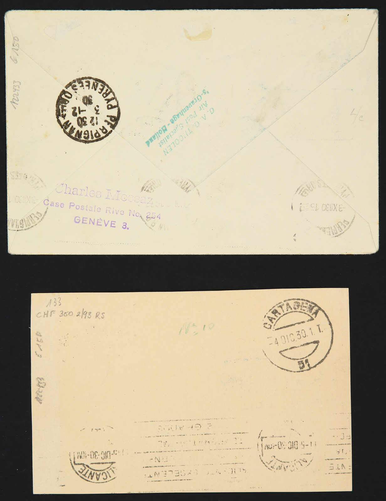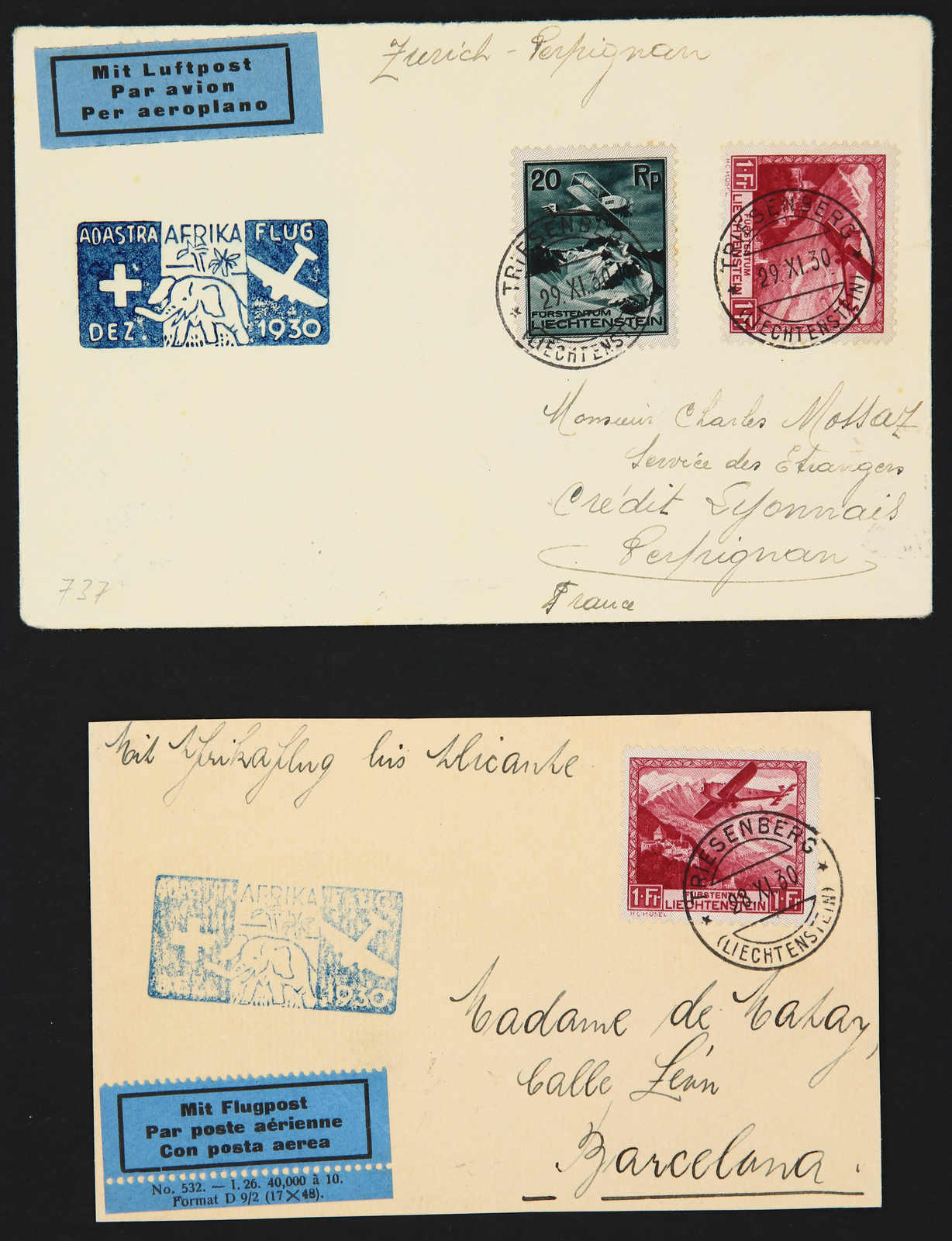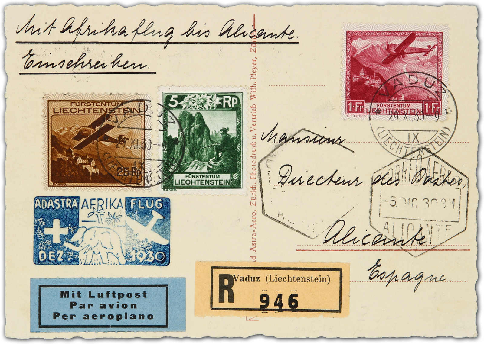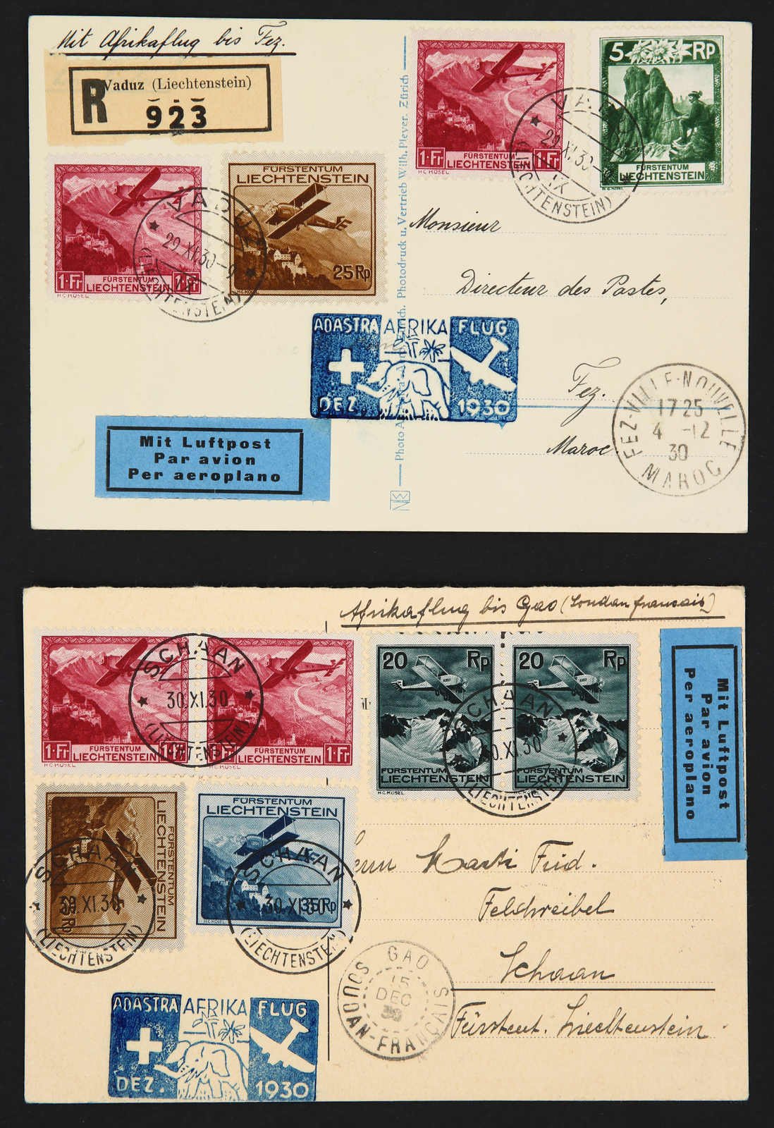 1930, III. Schweizer Afrikaflug vom 2.12.1930, 5 Etappenbelege ab Liechtenstein nach Perpignan, Alicante, Fez, Colomb Béchar und Gao, SLH SF 30.12 aL - eL