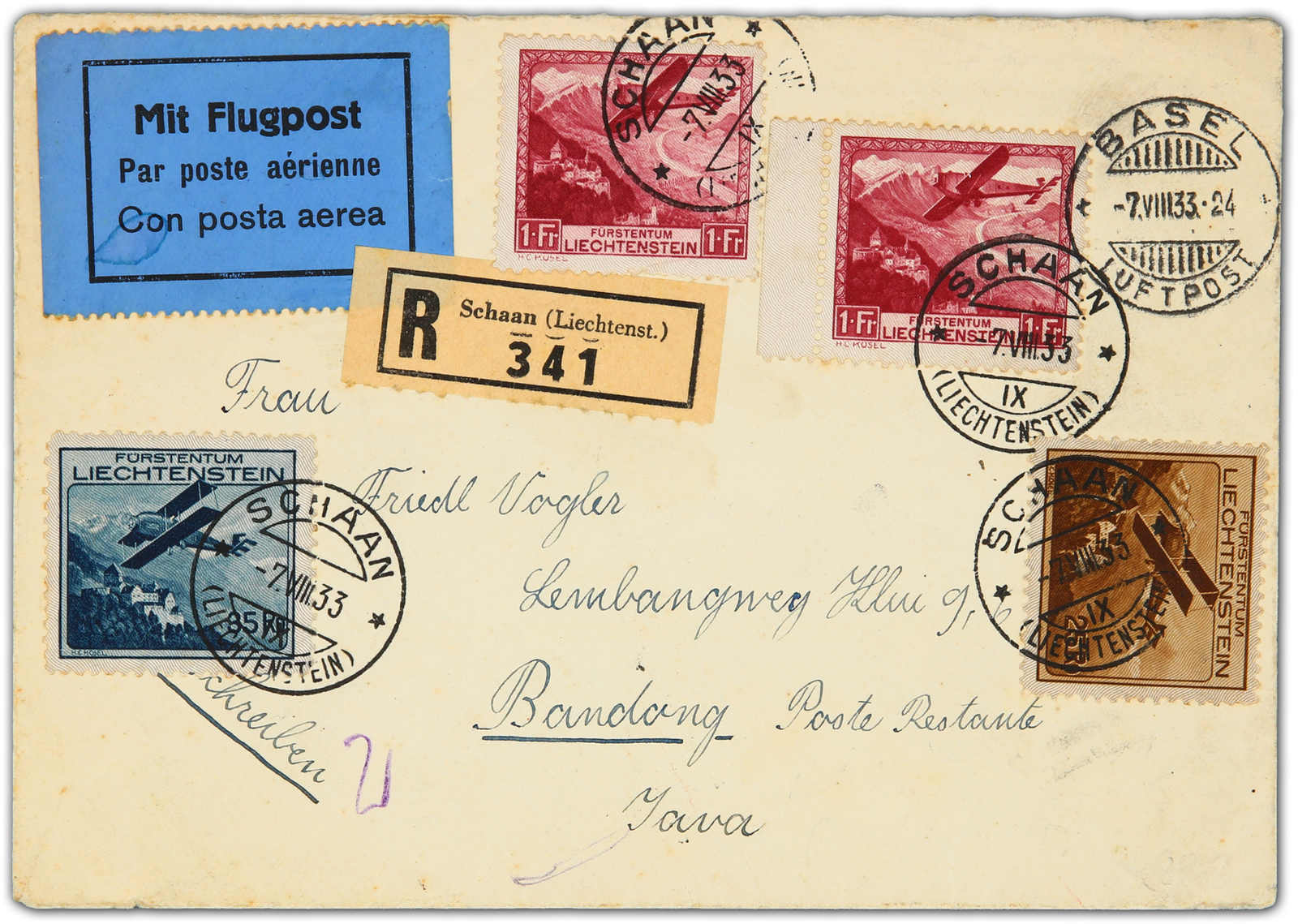 1933, R-LP-Brief ab Schaan 7.8.33 mit wertvoller Flugpostmarkenfrankatur von 2,60 FR. via Basel 7.8. nach Bandong/Java, Niederländisch Indien 18.8., Transportspuren (Image) (imagea)
