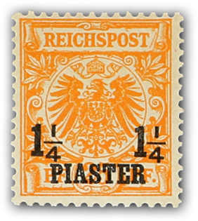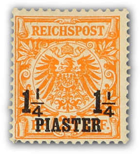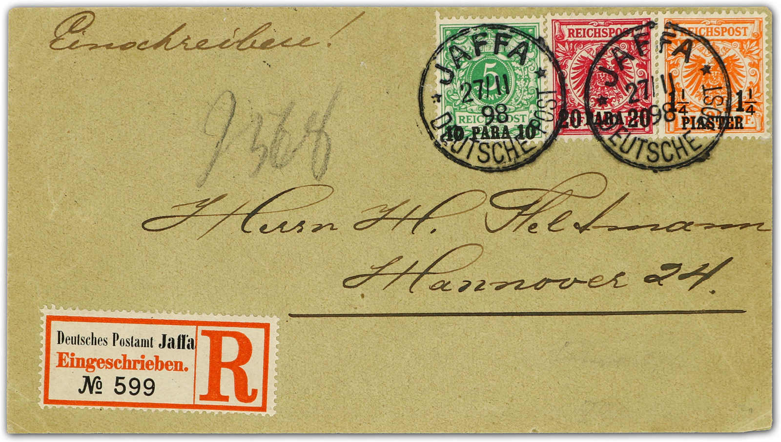 1898, 1¼ PIA auf 25 Pfg. Aufdruckausgabe dunkelorange, zusammen mit Mi-Nr. 6 c und 7 d auf portogerechtem R-Brief nach Hannover mit glasklaren Entwertungen "JAFFA 27/11 98", die 1¼ PIA eine gering ausgebesserte Ecke rechts unten, sonst