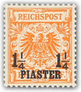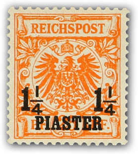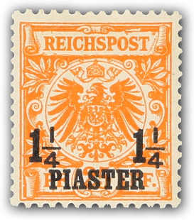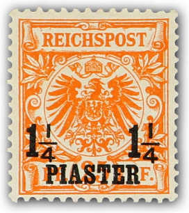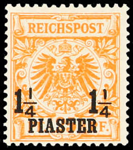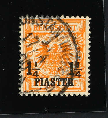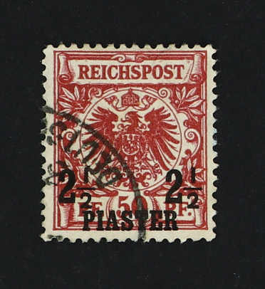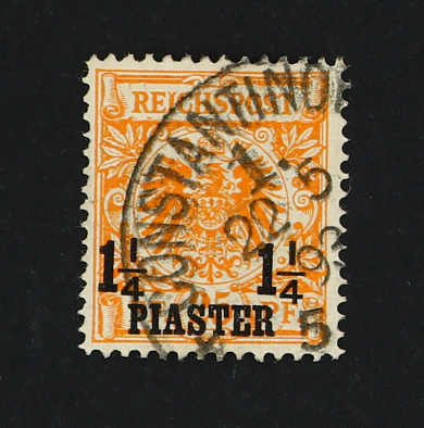 1889, 1¼ PIA auf 25 Pfg. Aufdruckausgabe gelblichorange, mit Plattenfehler "I in REICHSPOST oben gespalten", glasklar entwertet "CONSTANTINO(PEL) 22 5 93", einwandfrei, Fotobefund Jäschke-Lantelme BPP (ME 280,-) (Image) (imagea)
