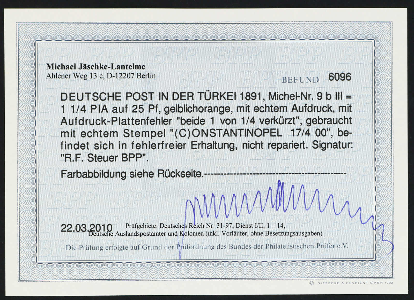 oben rechts ausgebrochen", klare Entwertungen "CONSTANTINOPEL 6/4 00", farbfrisch, einwandfrei, Fotoattest Jäschke-Lantelme BPP (ME 900,-+) (Image) (imagea)