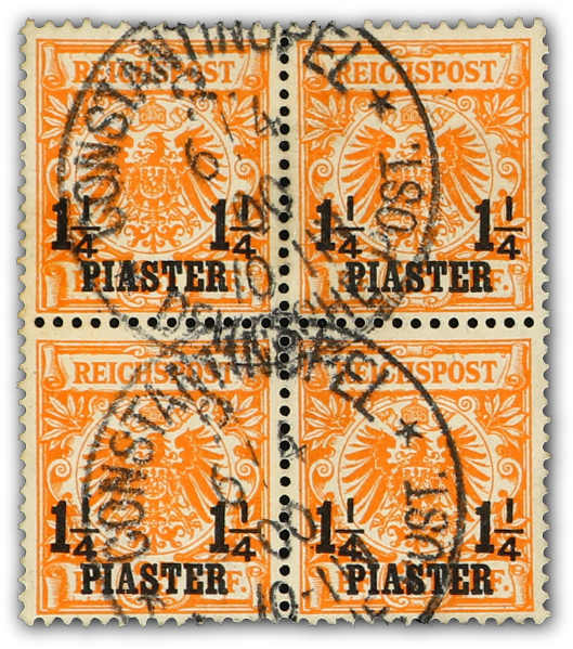 1889, 1¼ PIA auf 25 Pfg. Aufdruckausgabe gelblichorange, gestempelter Viererblock, dabei die linke untere Marke mit Aufdruckfehler "rechter Zähler von ¼ nach links verbogen" sowie die rechte untere Marke mit Plattenfehler "I in REICHSPOST