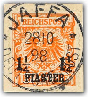1898, 1¼ PIA auf 25 Pfg. Aufdruckausgabe dunkelorange, glasklar und ideal zentrisch entwertet "JAFFA 28 10 98" auf dekorativem Briefstück, farbfrisch, einwandfrei, Fotoattest Jäschke-Lantelme BPP (ME 950,-+) (Image) (imagea)