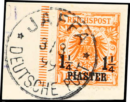 1898, 1¼ PIA auf 25 Pfg. Aufdruckausgabe dunkelorange, mit Aufdruckfehler "1 vom linken ¼ verkürzt", glasklar entwertet "JAFFA 3/3 99" auf dekorativem Briefstück, farbfrisch, einwandfreies Exemplar vom linken Bogenrand, signiert,