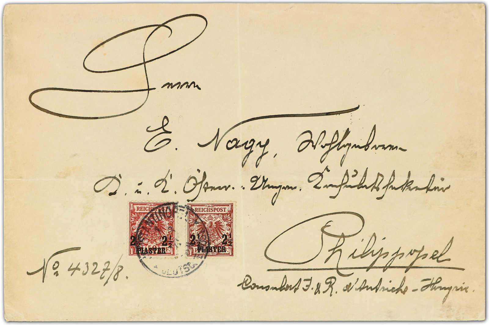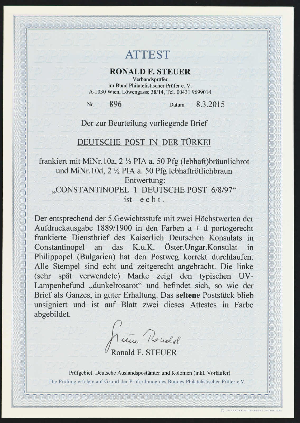 Gewichtsstufe) des Kaiserlich Deutschen Konsulats in Constantinopel an das K.u.K. Öster.Ungar.Konsulat in Philippopel mit sauberer Entwertung "CONSTANTINOPEL 1 DEUTSCHE POST 6 8 97" und rückseitigem Ankunftsstempel, Marken einwandfrei, Umschlag