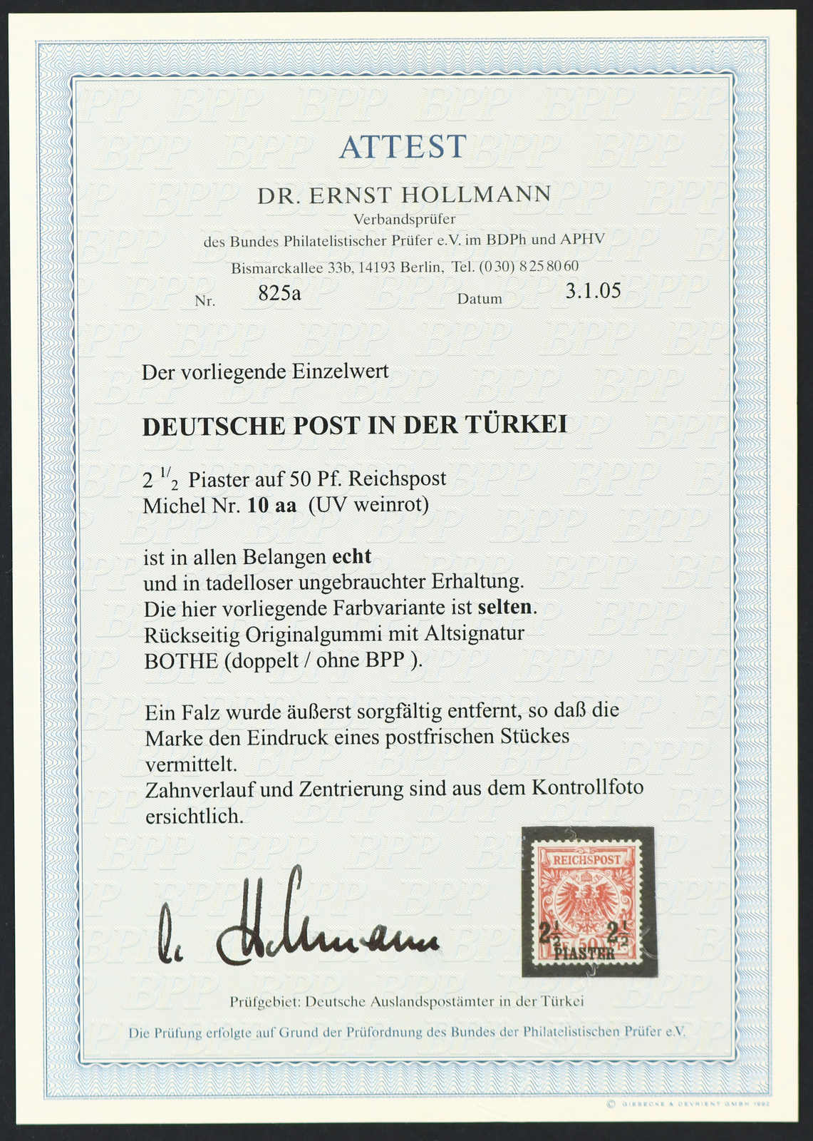 1889, 2½ PIA auf 50 Pfg. Aufdruckausgabe bräunlichkarmin, braunkarmin quarzend, ungebraucht, einwandfrei, signiert Bothe, die seltenste Farbe dieser Ausgabe nahezu postfrisch, da sehr sorgfältig entfalzt! Fotoattest Hollmann BPP (ME