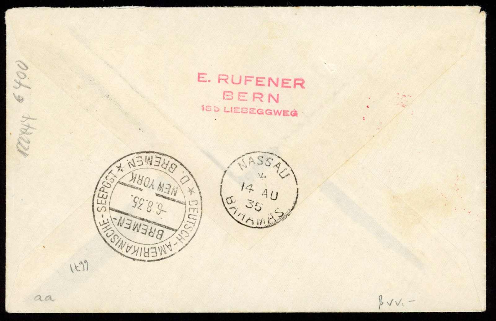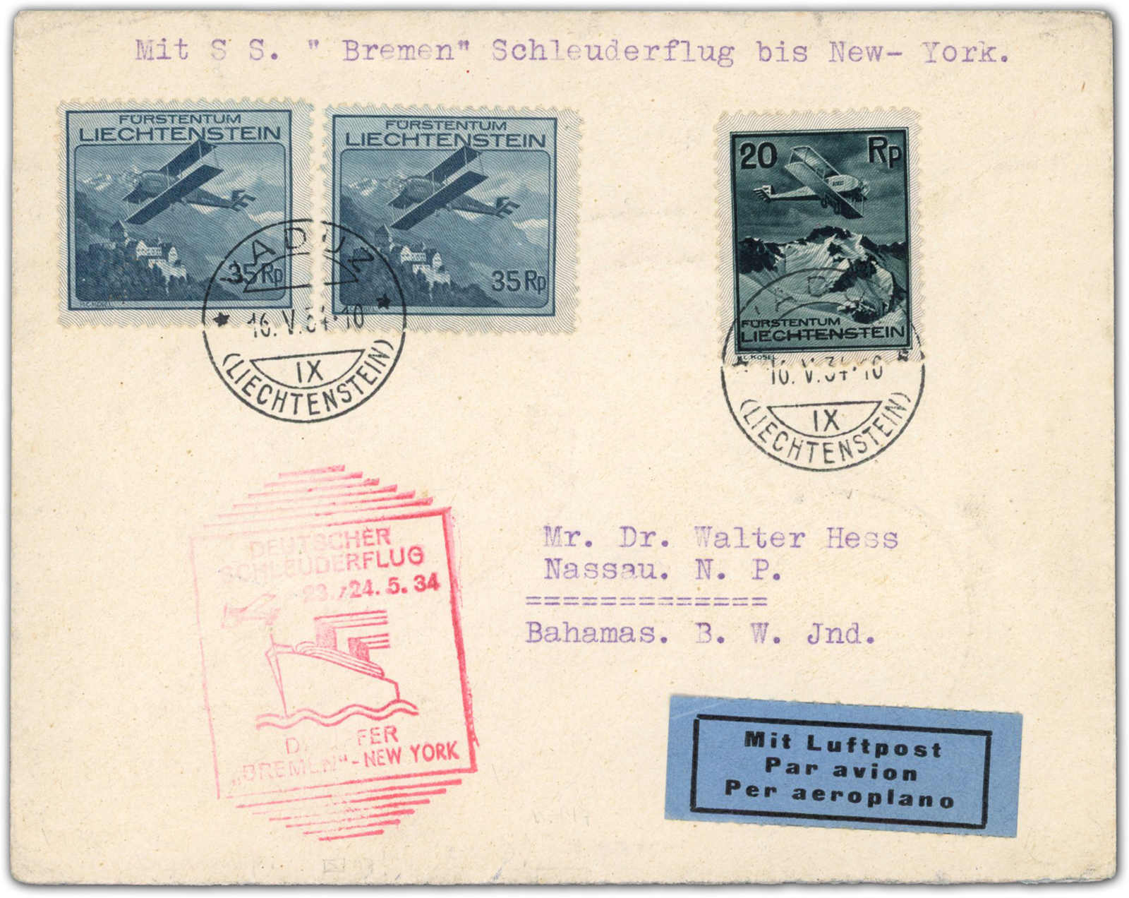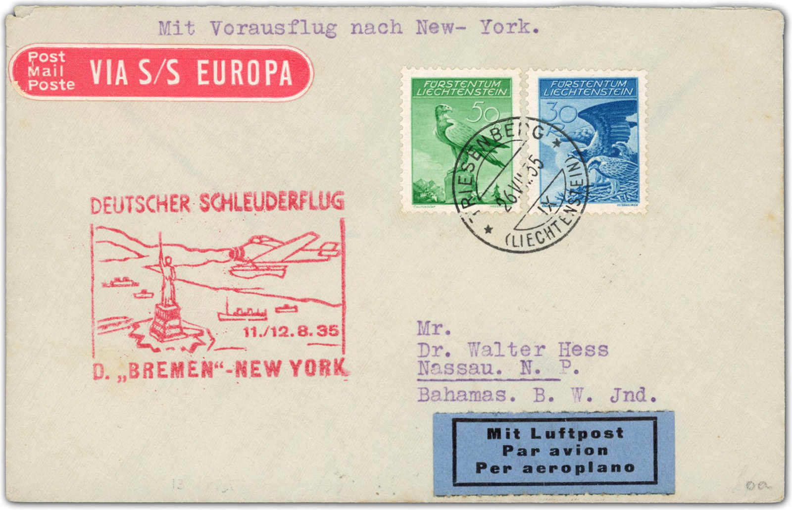 1935, Zuleitungspost Liechtenstein, Brief ab Triesenberg 26.7.35 zum Dampfer Bremen 6.8. und Katapultflug nach New York vom 11.8., adressiert nach Nassau / Bahamas 14.8., nur 13 Stück bekannt (Image) (imagea)
