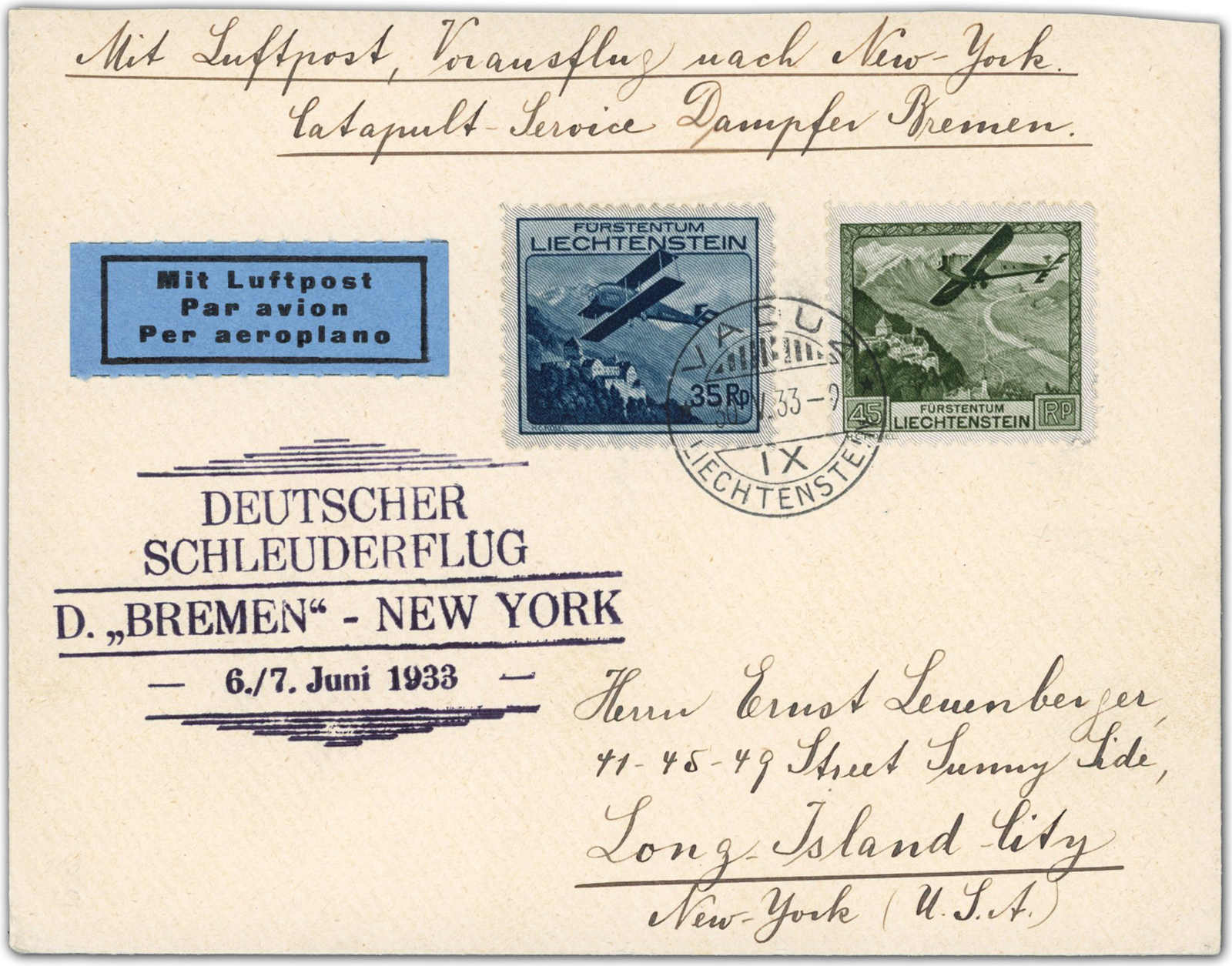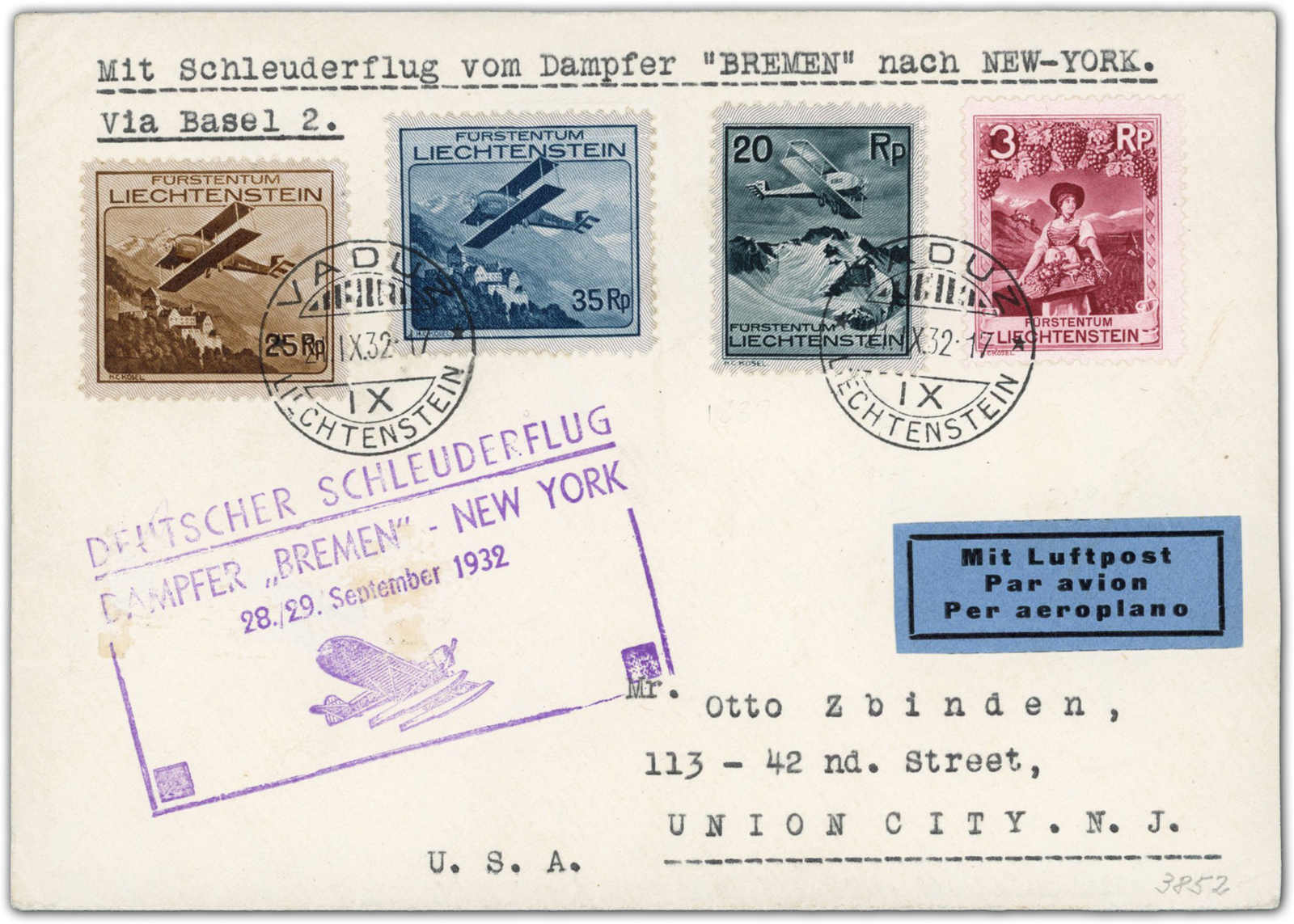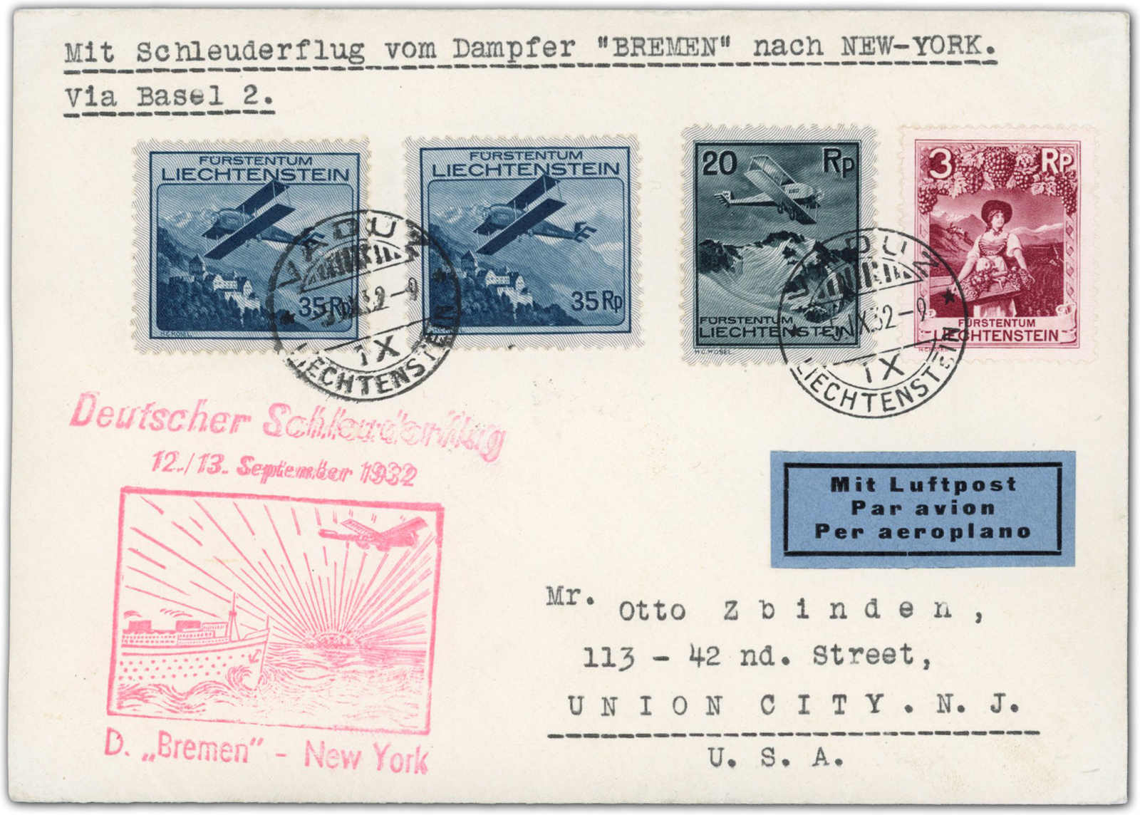 1932, Zuleitungspost Liechtenstein, Brief ab Vaduz 5.9.32 zum Dampfer Bremen 8.9.und mit Katapultflug Bremen - New York vom 13.9. nach Union City