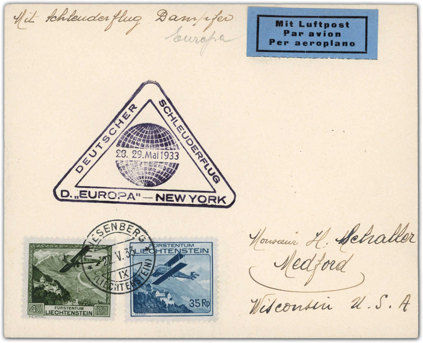 1933, Zuleitungspost Liechtenstein, Brief ab Triesenberg 22.5.33 zum Katapultflug Europa - New York vom 28.5.. adressiert nach Medford, nur 9 Stück ab Liechtenstein bekannt (Image) (imagea)