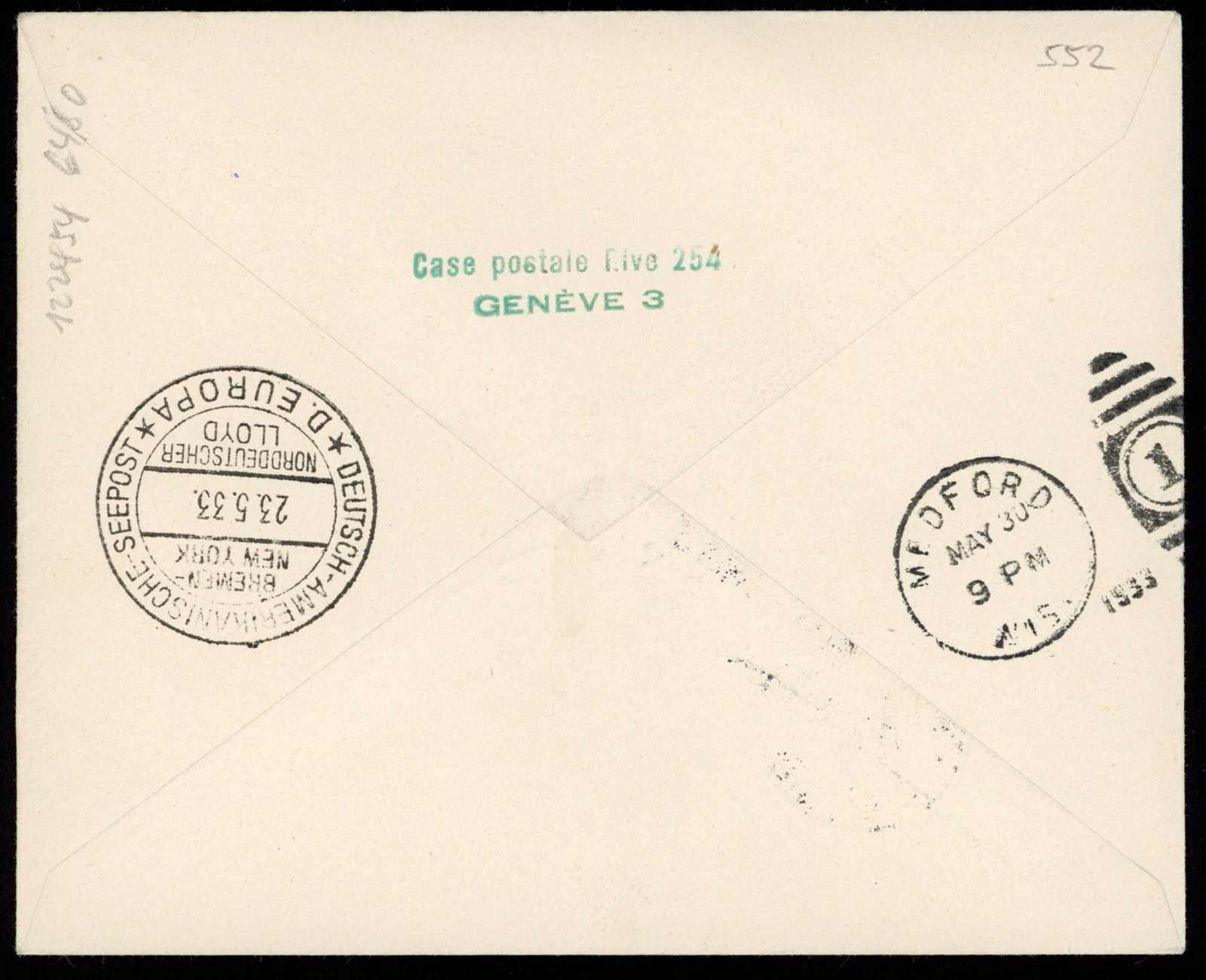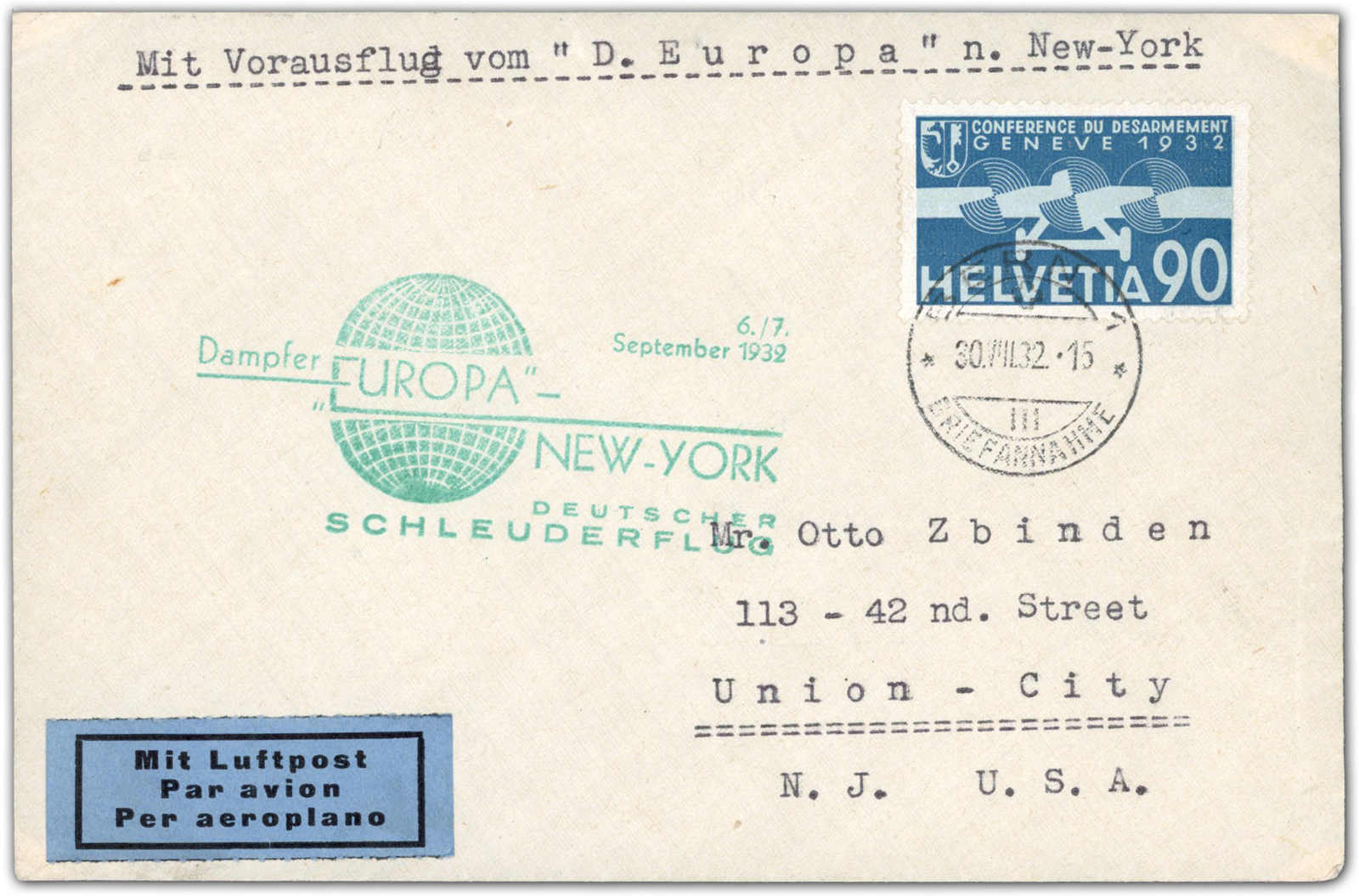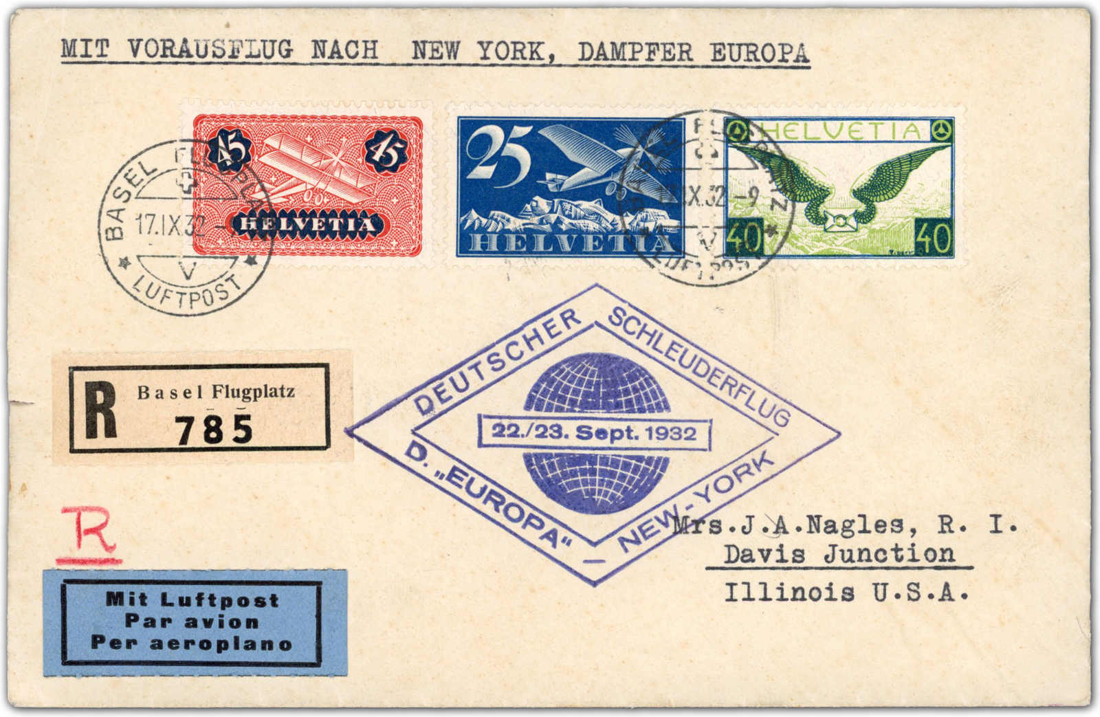 1932, Zuleitungspost Schweiz, R-Brief ab Basel 17.9. mit Katapultflug Europa - New York vom 22.9. nach New York, adressiert nach Davis Junction