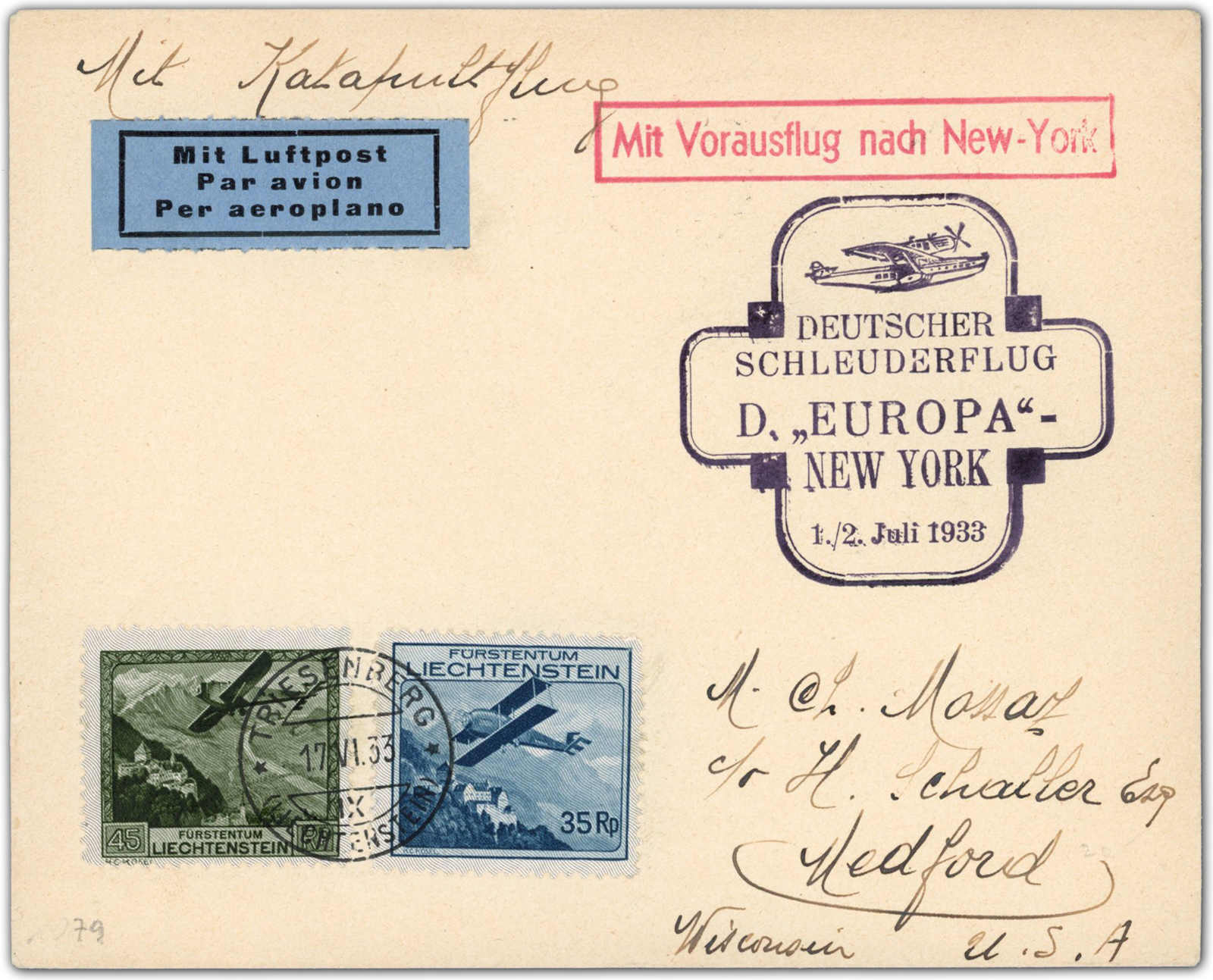 1933, Zuleitungspost Liechtenstein, Brief ab Triesenberg 17.6.33 zum Katapultflug Europa - New York vom 1.7. adressiert nach Medford 3.7., nur 16 Stück ab Liechtenstein bekannt (Image) (imagea)