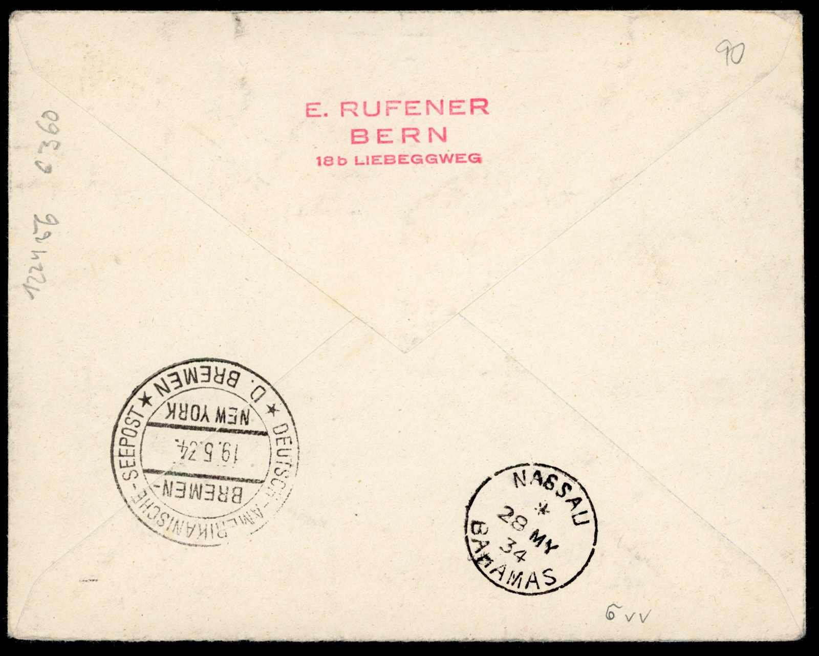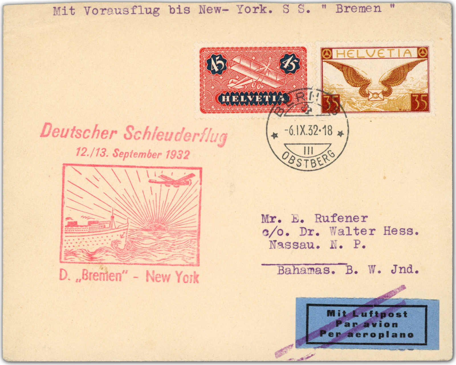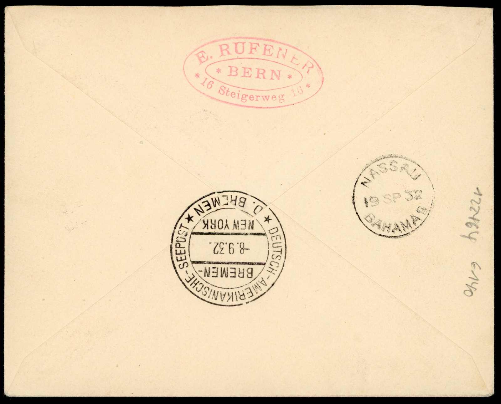 1932, Zuleitungspost Schweiz, Brief ab Bern 6.9.32 zum Dampfer Bremen 8.9. und mit Katapultflug Bremen - New York vom 13.9. nach New York, adressiert nach Nassau / Bahamas 19.9. (Image) (imagea)
