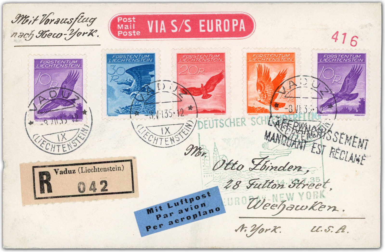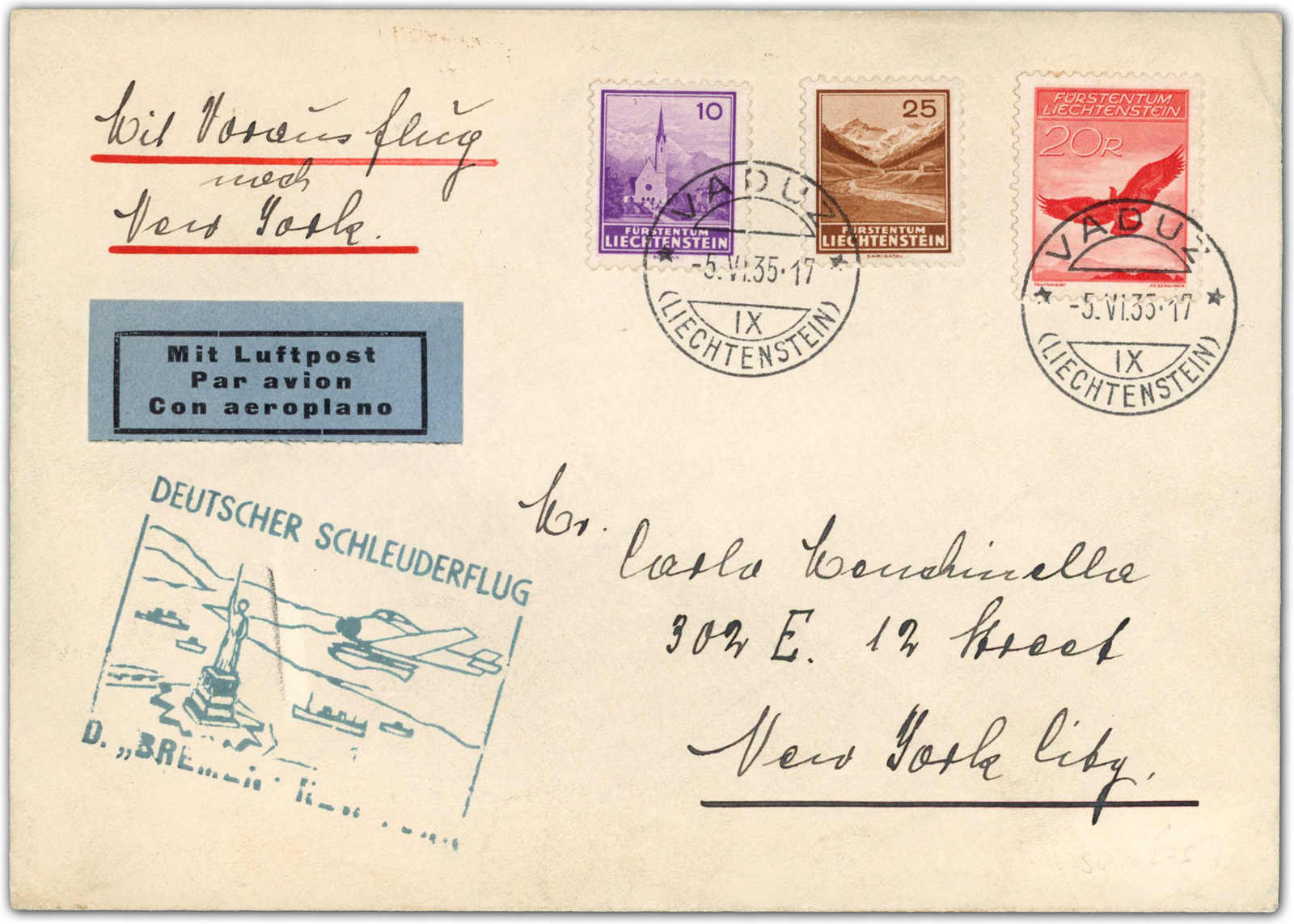 1935, Zuleitungspost Liechtenstein, Brief mit wertvoller Frankatur ab Vaduz 5.6.35 mit Katapultflug Bremen - New York vom 12.6. nach New York, nur 8 Stück ab Liechtenstein bekannt (Image) (imagea)