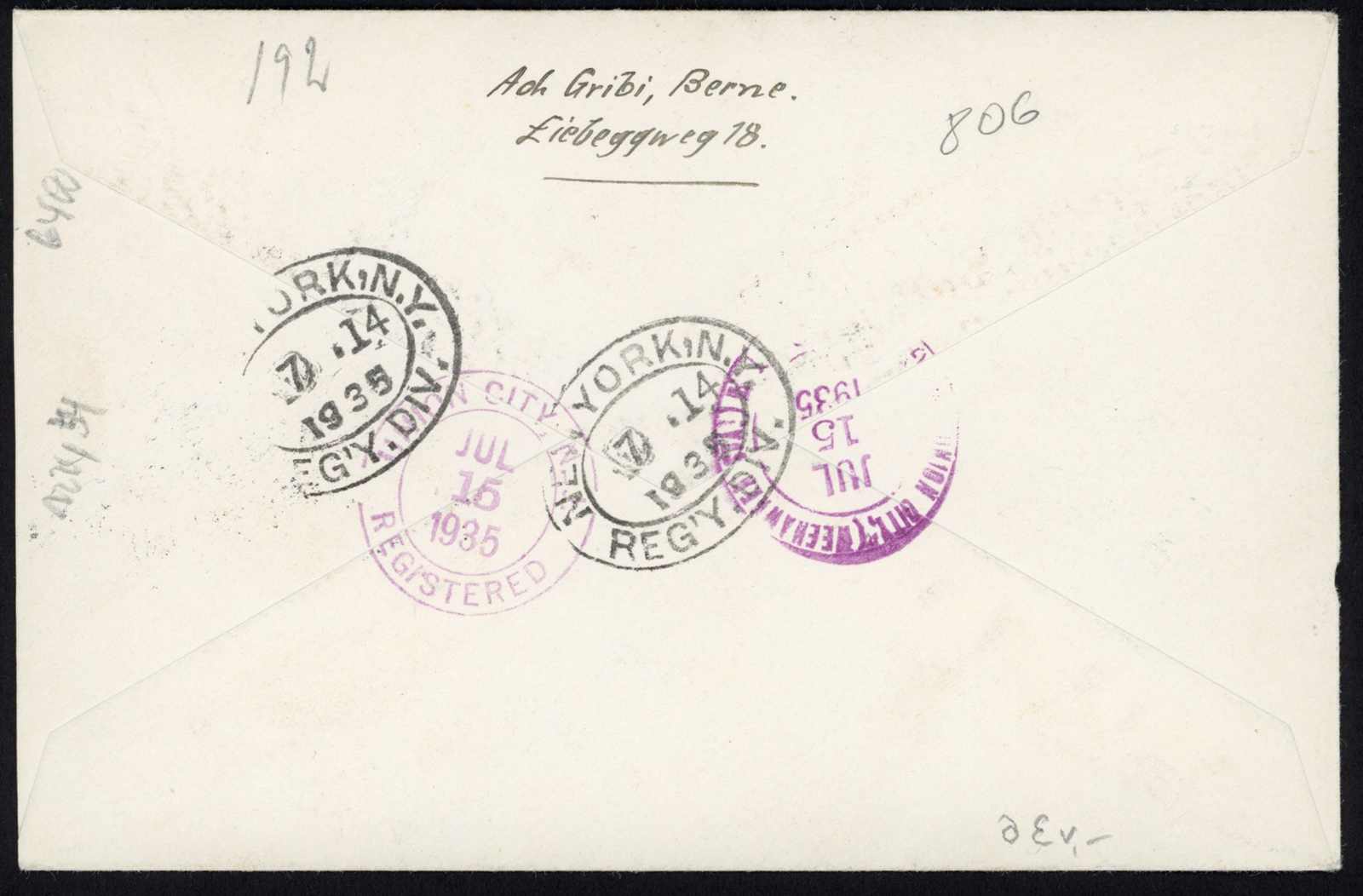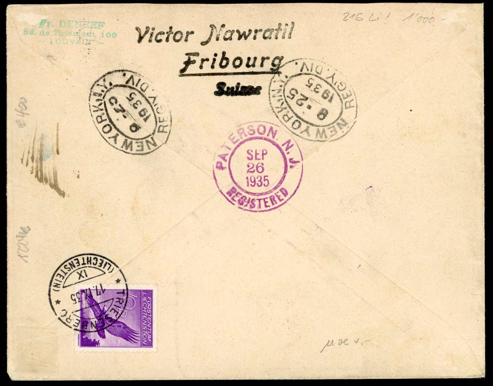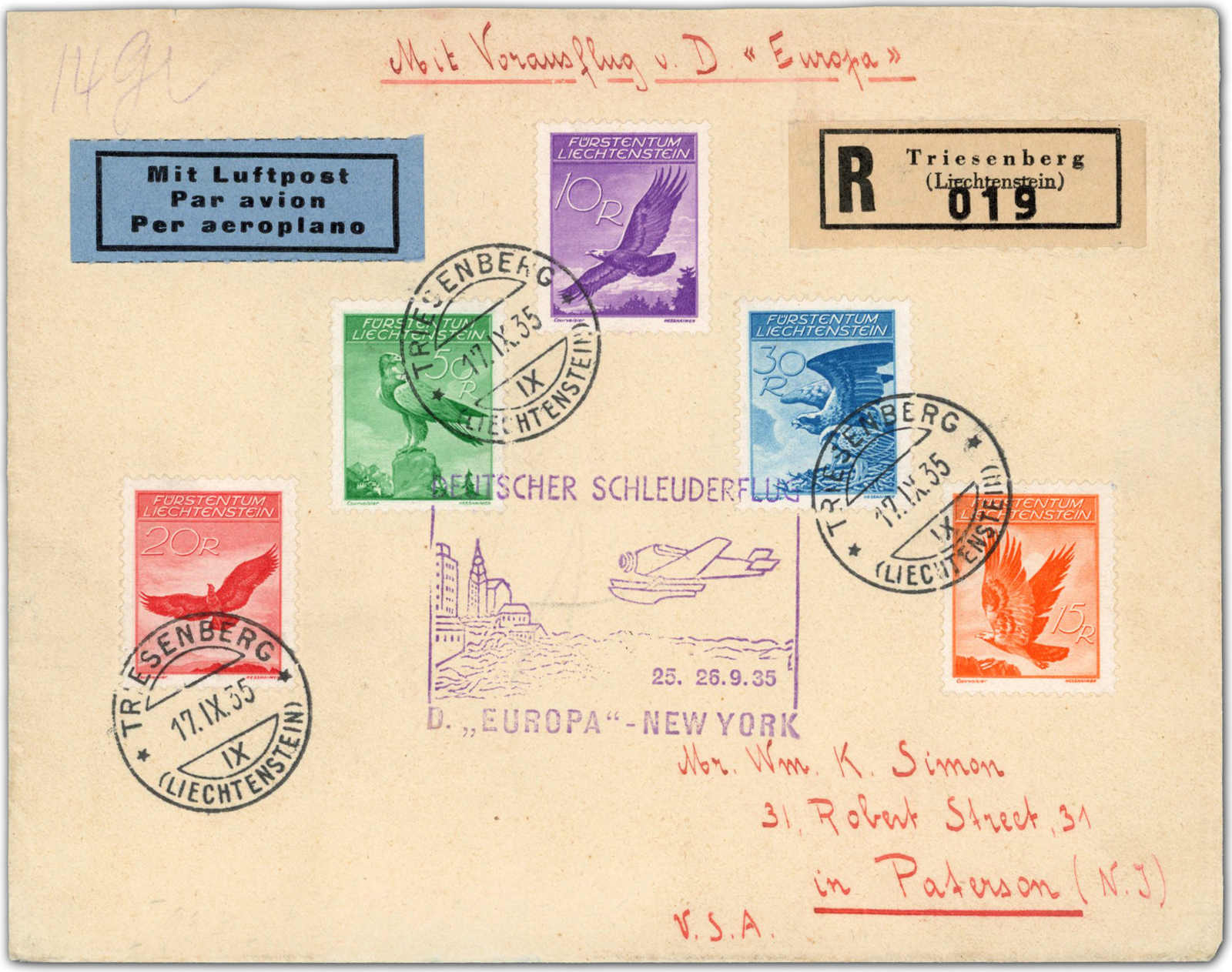 1935, Zuleitungspost Liechtenstein, R-Brief ab Triesenberg 12.9.35 mit Katapultflug Europa - New York vom 25.9. nach Paterson 26.9. (Image) (imagea)