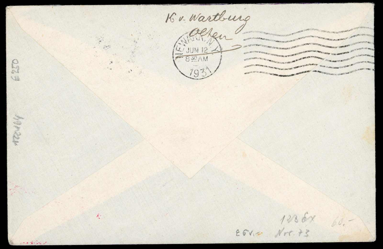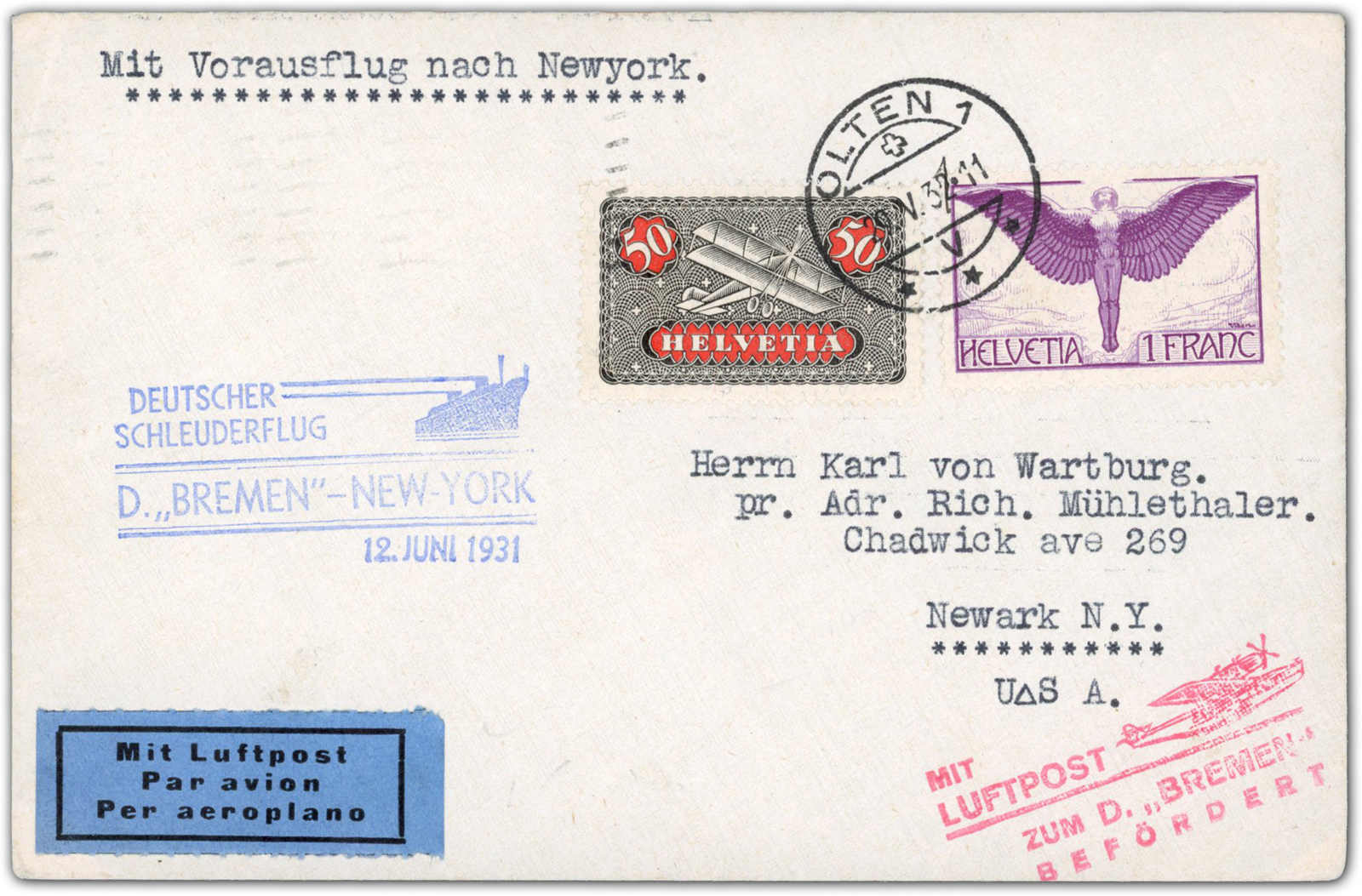 1931, Zuleitungspost Schweiz, Brief ab Olten 29.5.31 mit Nachbringeflug zum Dampfer Bremen und mit Katapultflug Bremen - New York vom 12.6. nach Newark 12.6., nur ca. 30 Stück ab Schweiz befördert (Image) (imagea)