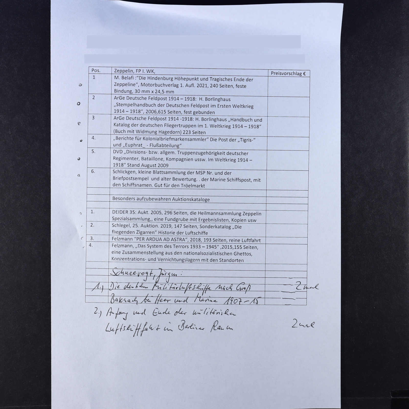Literaturkonvolut, 10 Bücher zum Thema Luftpost und Zeppelin und sowie Erster Weltkrieg, darunter Werke über Poststempel, Fliegertruppen, Schiffpost, Kolonien, zusätzlich 4 besondere Auktionskataloge über Aerophilatelie (3) und NS-Terror