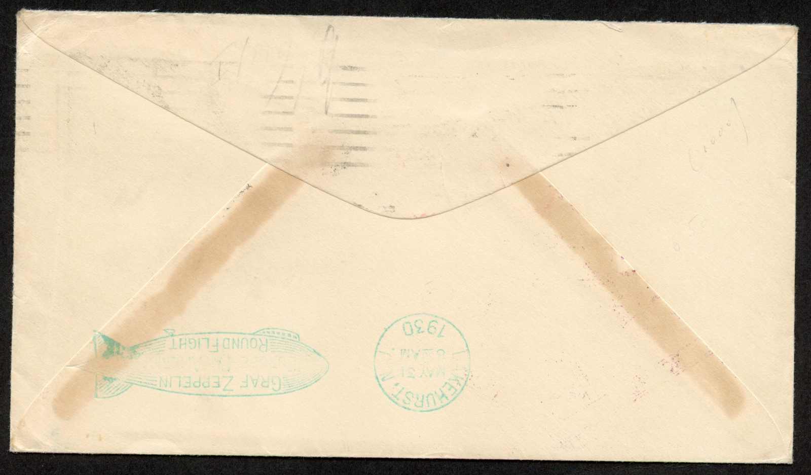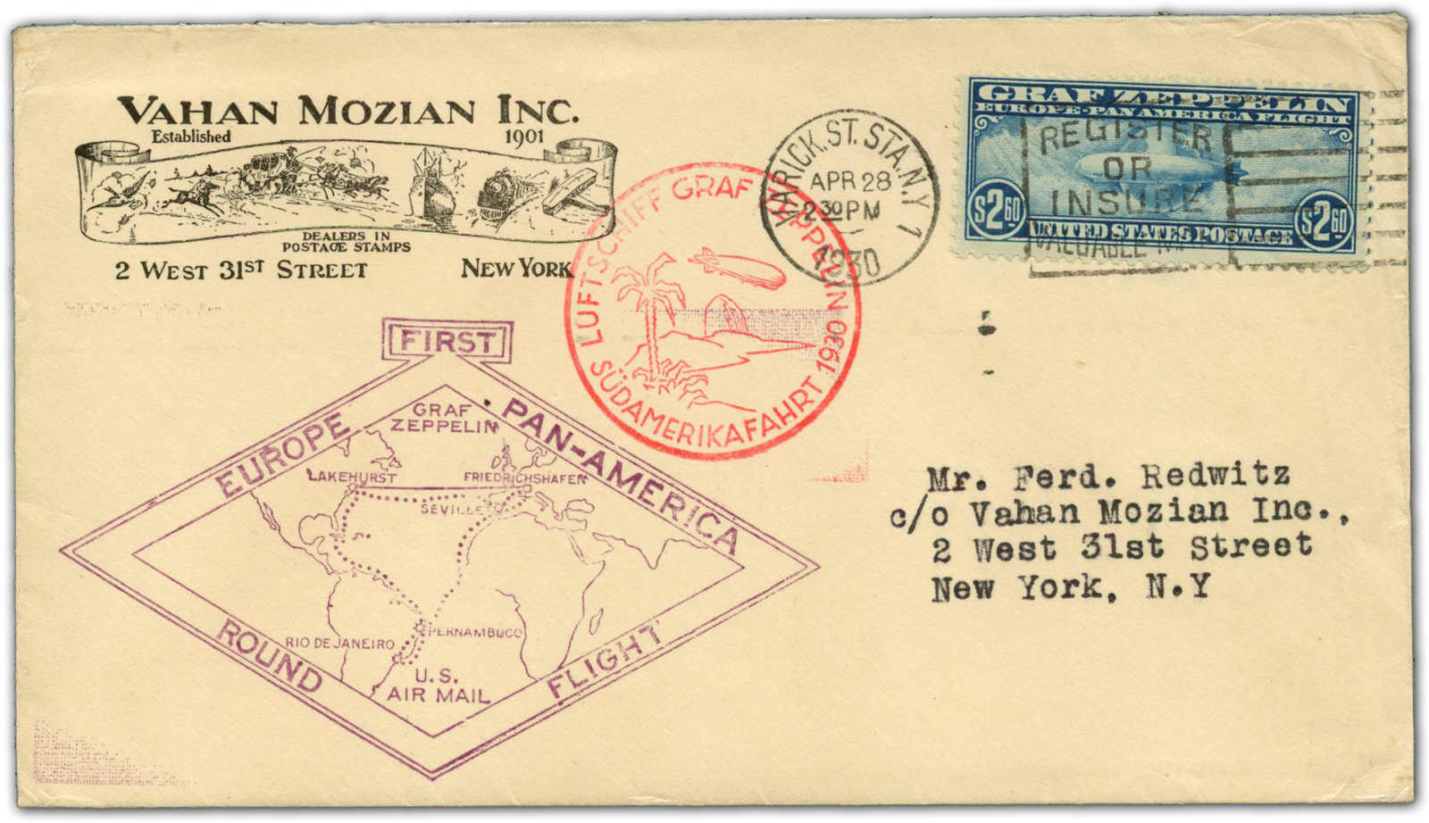 9659 Brief MichelZeppelinundLuftp image1930, 2,60 $ Zeppelin als Einzelfrankatur auf Zeppelinbrief der Südamerikafahrt, aufgegeben "VARICK ST. STA. N.Y. 28. APR 1930", adressiert nach New York, vorderseitig beide Bestätigungsstp., rückseitig grüner Bestätigungsstp. der Rundfahrt, gute Qualität (Image) (imagea)