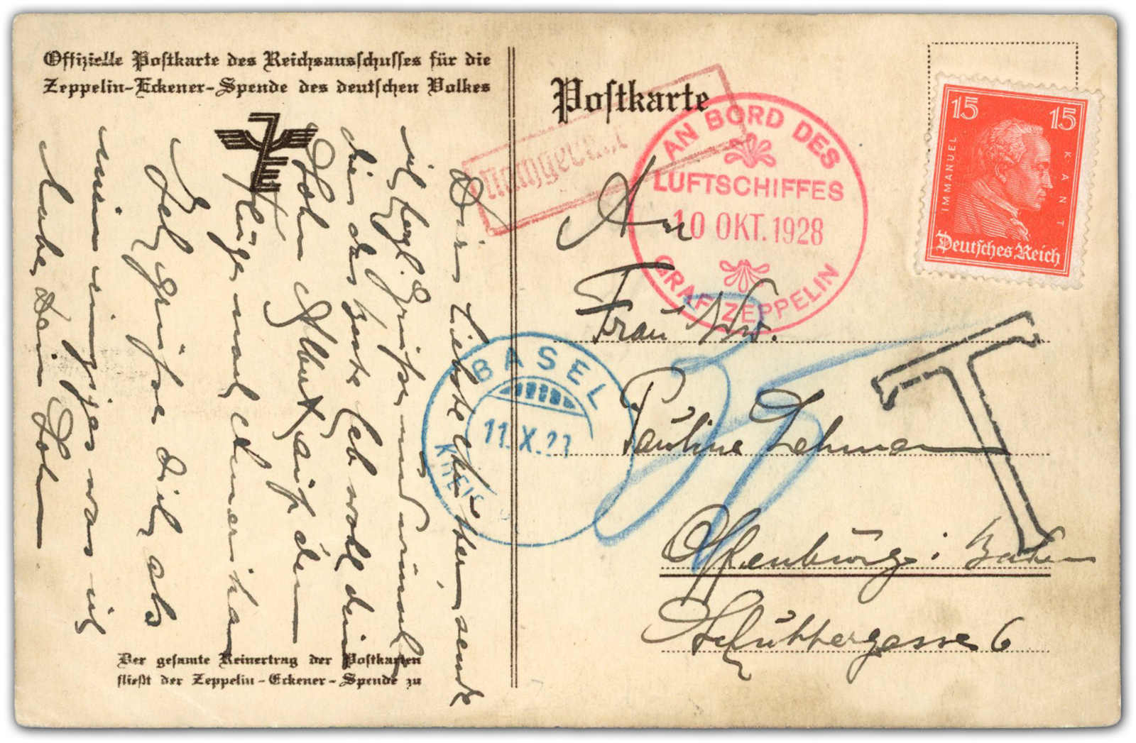 9654 Brief MichelZeppelinundLuftp image1928, Amerikafahrt, Abwurf Basel, Eckener Spendenkarte geschrieben von Stewart Lehmann mit Bordstempel vom 10.10.1928, abgeworfen über Basel 11.10., frankiert mit 15 Pfg., diese in Basel nicht anerkannt, daher Nachgebühr "T" und "30", adressiert an seine Mutter in Offenburg (Image) (imagea)