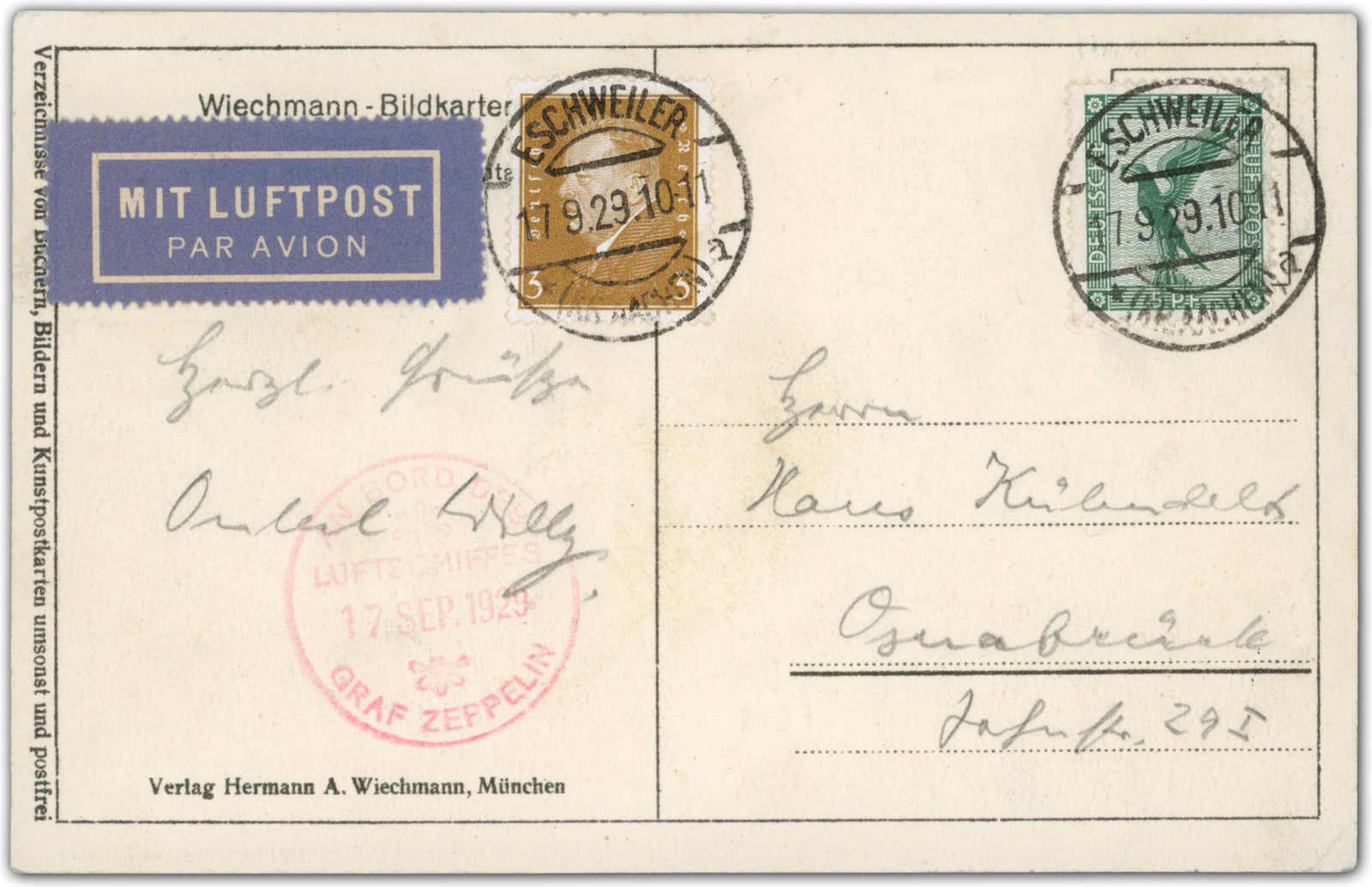 9641 Brief MichelZeppelinundLuftp image1929, Deutschlandfahrt, Abwurf Eschweiler, Bordpost-Künstlerkarte mit Grußtext, Frankatur entwertet Eschweiler 17.9.29 adressiert nach Osnabrück, Fotoattest Sieger AIEP (Image) (imagea)
