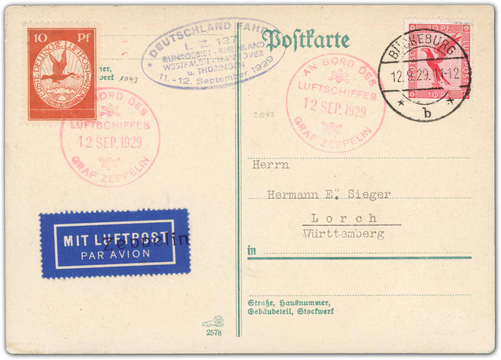 9640 Brief MichelZeppelinundLuftp image1929, Deutschlandfahrt, Abwurf Bückeburg, Bordpost-Karte mit 10 Pfg. Rhein-Main Flugmarke "entwertet" mit rotem Bordstempel vom 12.9.29 und 10 Pfg. Flugpostmarke mit Tagesstempel Eschweiler 12.9.29 adressiert nach Lorch (Image)