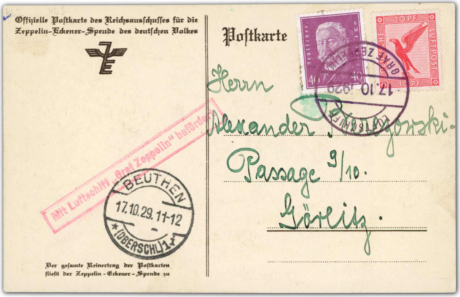 9642 Brief MichelZeppelinundLuftp image1929, Schlesienfahrt, Abwurf Beuthen, Eckener Spendenkarte mit Bordpoststempel vom 17.10.29, Ankunft Beuthen 17.10.29 adressiert nach Görlitz (Image) (imagea)
