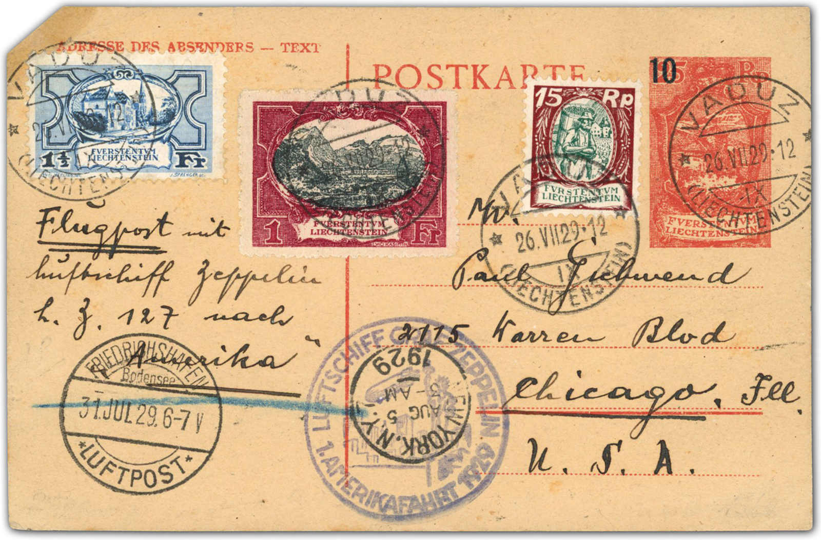 9656 Brief MichelZeppelinundLuftp image1929, Amerikafahrt, Zuleitungspost LIECHTENSTEIN, GA-Karte mit fehlender Ecke oben links und Zusatzfrankatur ab Vaduz 26.7.29 via Friedrichshafen 31.7. nach New York 5.8., Michel wertet den Beleg mit 8.000 Euro - in Anbetracht der vorliegenden Qualität ist unser Ausrufspreis sehr moderat (Image) (imagea)
