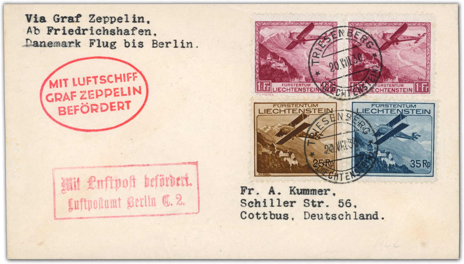 9643 Brief MichelZeppelinundLuftp image1930, Ostpreußenfahrt, Zuleitungspost LIECHTENSTEIN, Etappe Friedrichshafen - Berlin, Brief mit wertvoller Frankatur ab Triesenberg 20.8.30 via Friedrichshafen nach Berlin Staaken 24.8. (Image) (imagea)