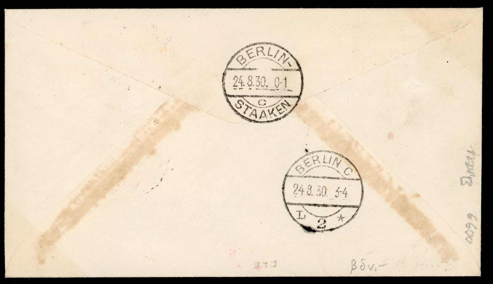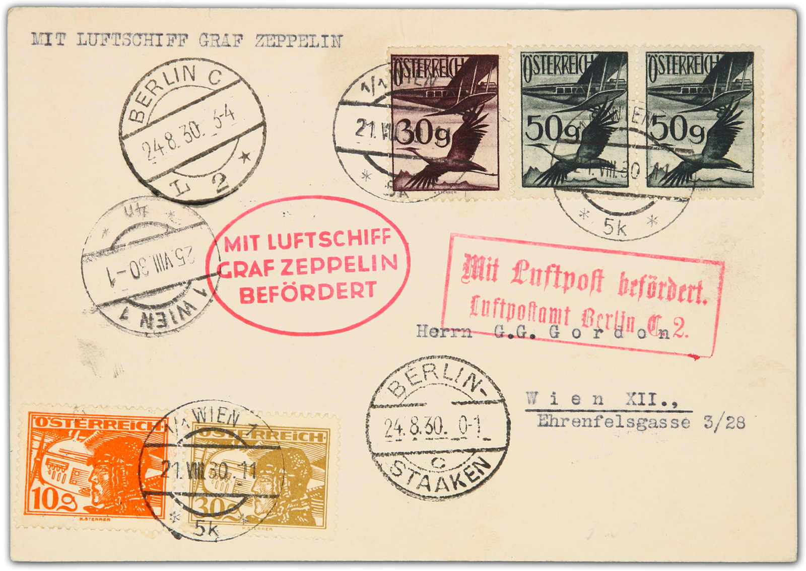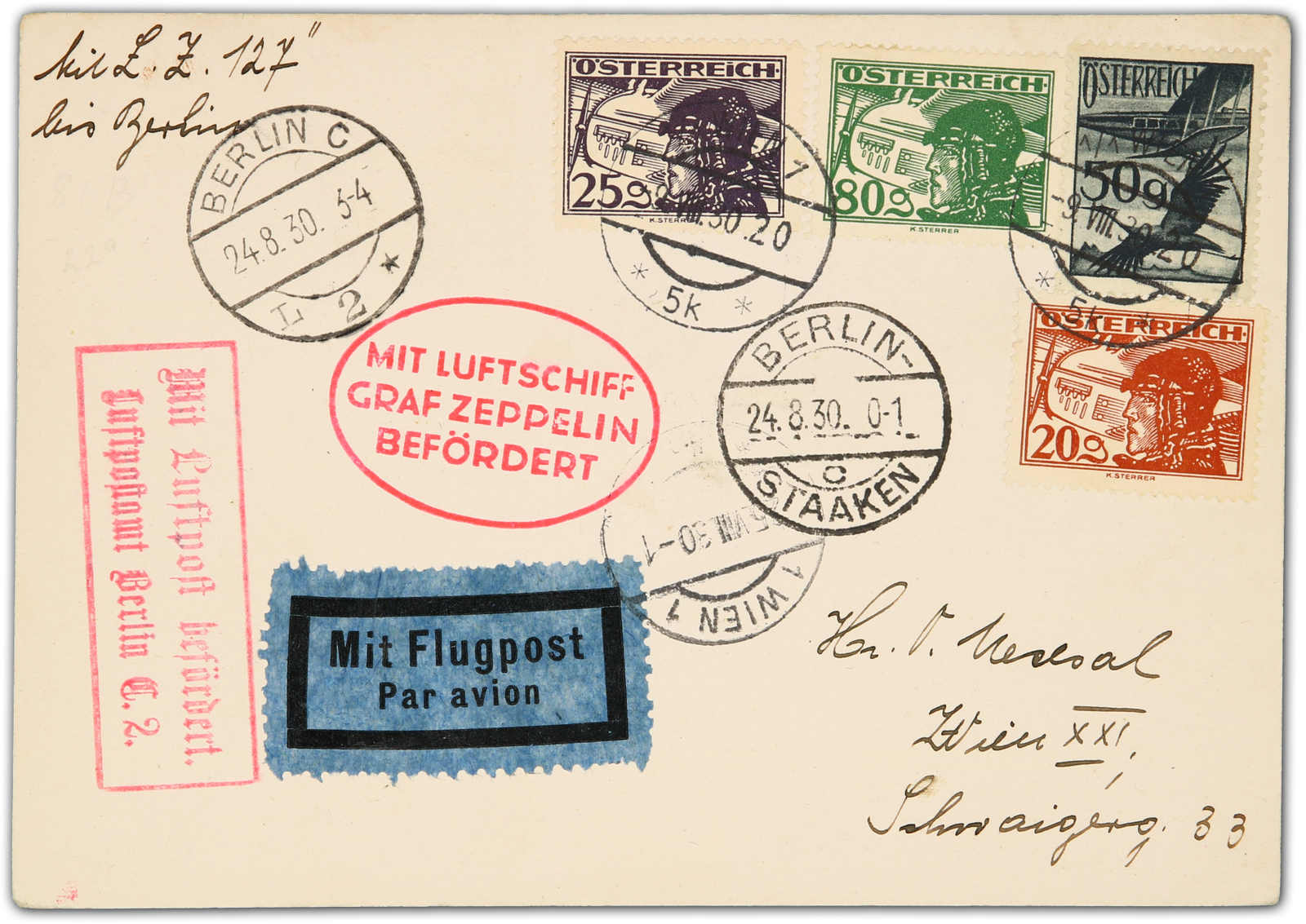 9644 Brief MichelZeppelinundLuftp image1930, Königsbergfahrt, Etappe bis Berlin, Zuleitungspost ÖSTERREICH, Karte ab Wien 21.8.30 via Friedrichshafen nach Berlin-Staaken 24.8. (Image) (imagea)