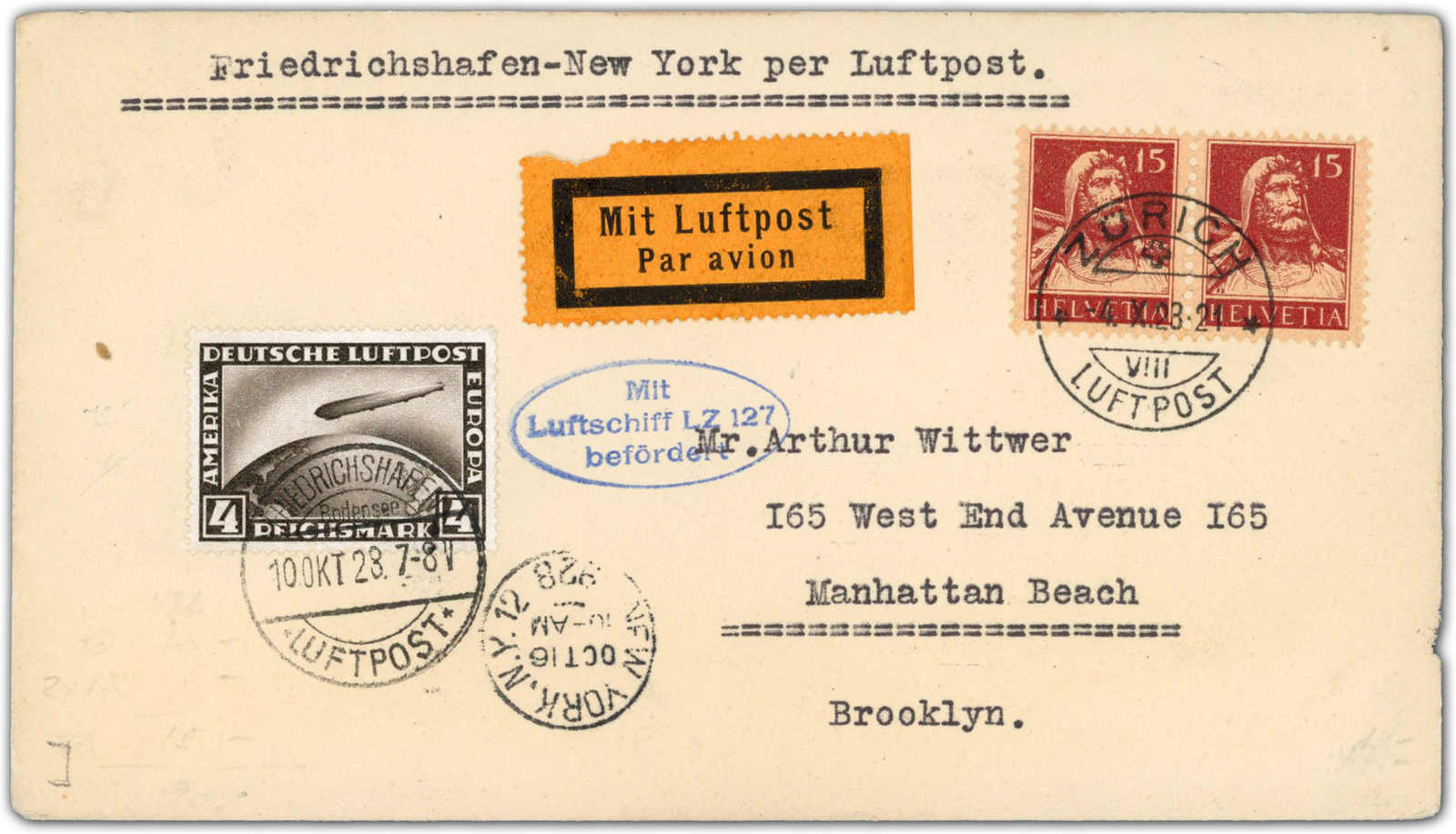 9653 Brief MichelZeppelinundLuftp image1928, Amerikafahrt, Zuleitungspost SCHWEIZ, Brief mit Zweiländerfrankatur ab Zürich 4.10.28 via Friedrichshafen 10.10. nach New York 16.10. (Image)