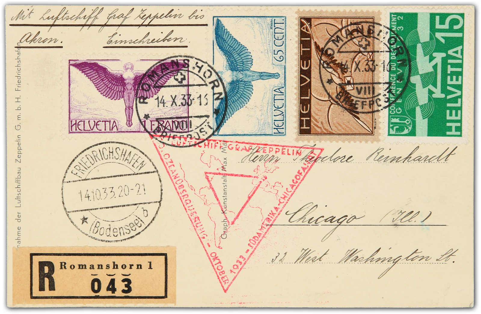 9658 Brief MichelZeppelinundLuftp image1933, Chicagofahrt, Etappe Friedrichshafen - Akron, Zuleitungspost SCHWEIZ, R-Fotokarte ab Romanshorn 14.10.33 via Friedrichshafen 14.10. nach Akron mit Ank.-Stp. bildseitig (Image) (imagea)