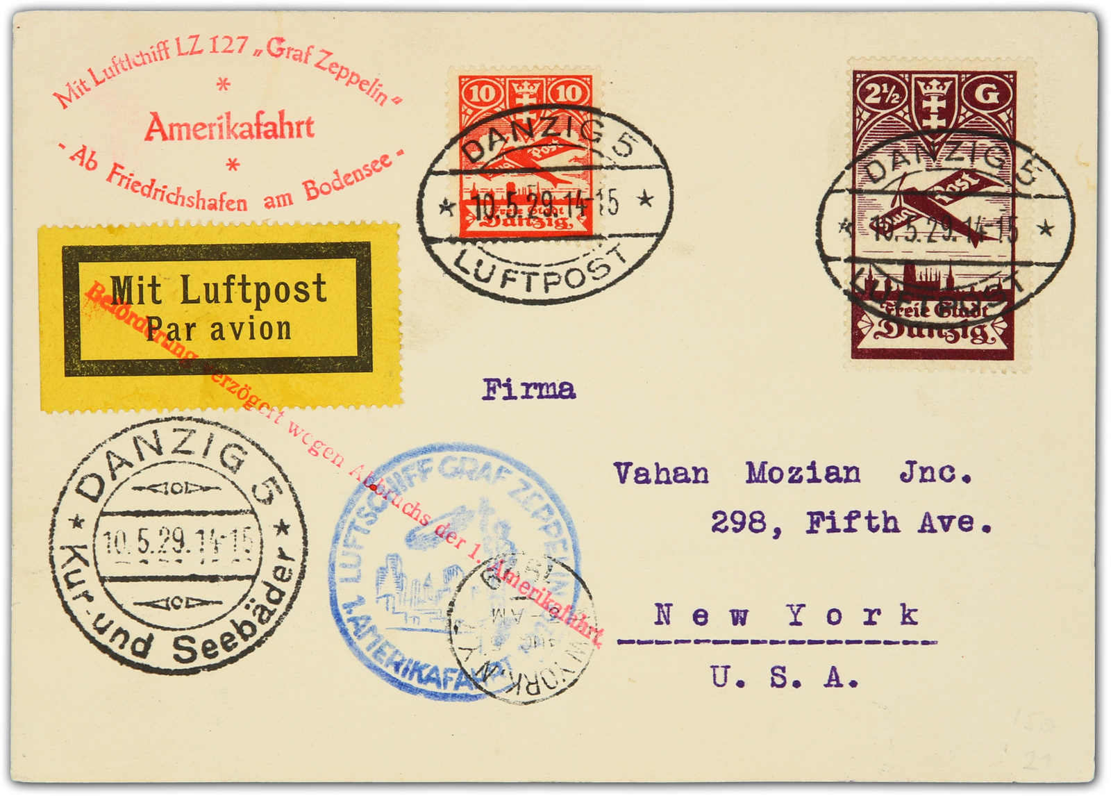 9655 Brief MichelZeppelinundLuftp image1929, abgebrochene Amerikafahrt, Zuleitungspost DANZIG, Karte ab Danzig 10.5.29 via Friedrichshafen nach New York 5.8. (Image)