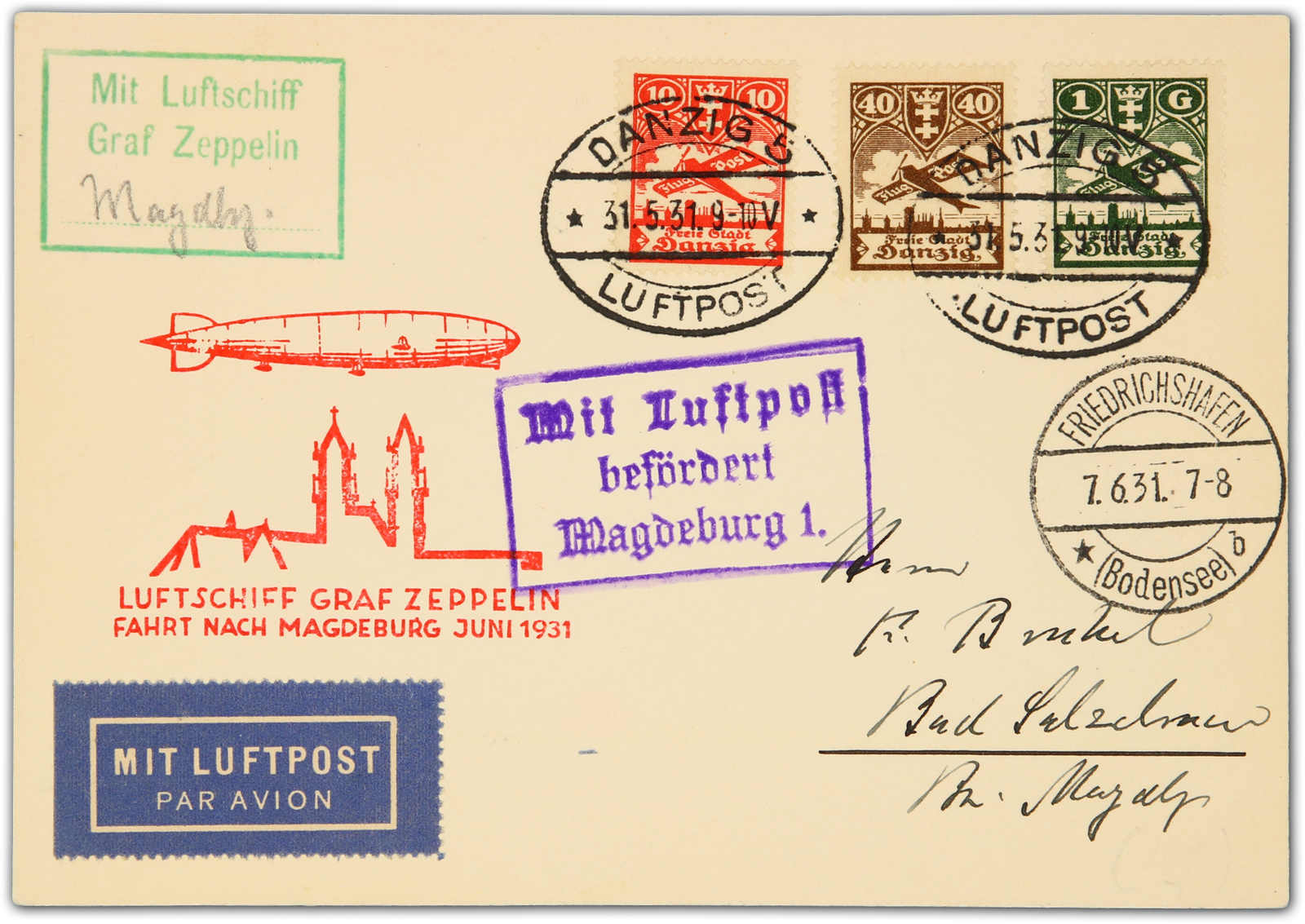 9647 Brief MichelZeppelinundLuftp image1931, Magdeburgfahrt, Zuleitungspost DANZIG, Karte ab Danzig 31.5.31 via Friedrichshafen 7.6. nach Magdeburg (Image)