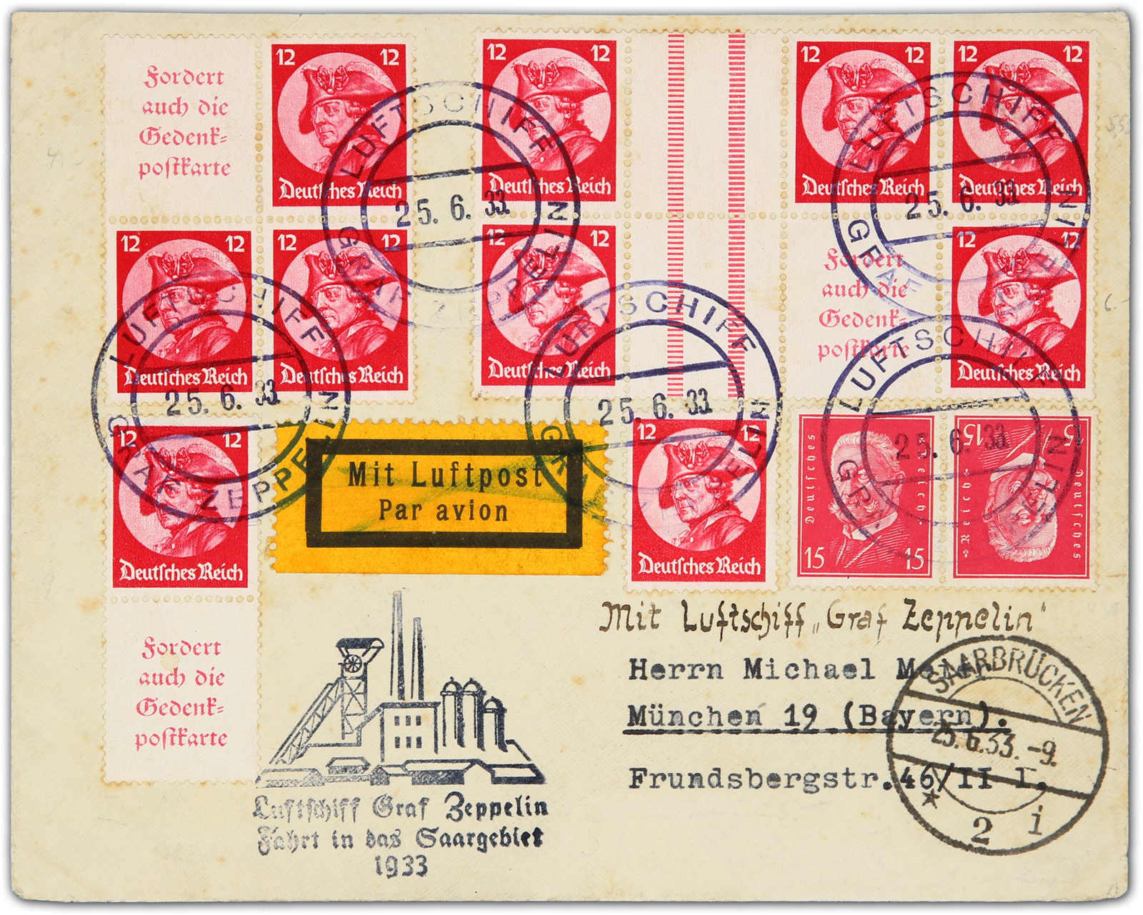 9649 Brief MichelZeppelinundLuftp image1933, Saargebietsfahrt, Hinfahrt, Bordpostbrief mit roten ZD-Frankaturen vom 25.6.33 nach Saarbrücken 25.6., etwas unsauber (Image)