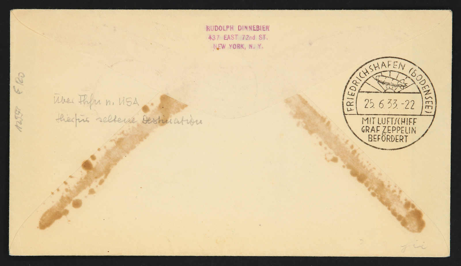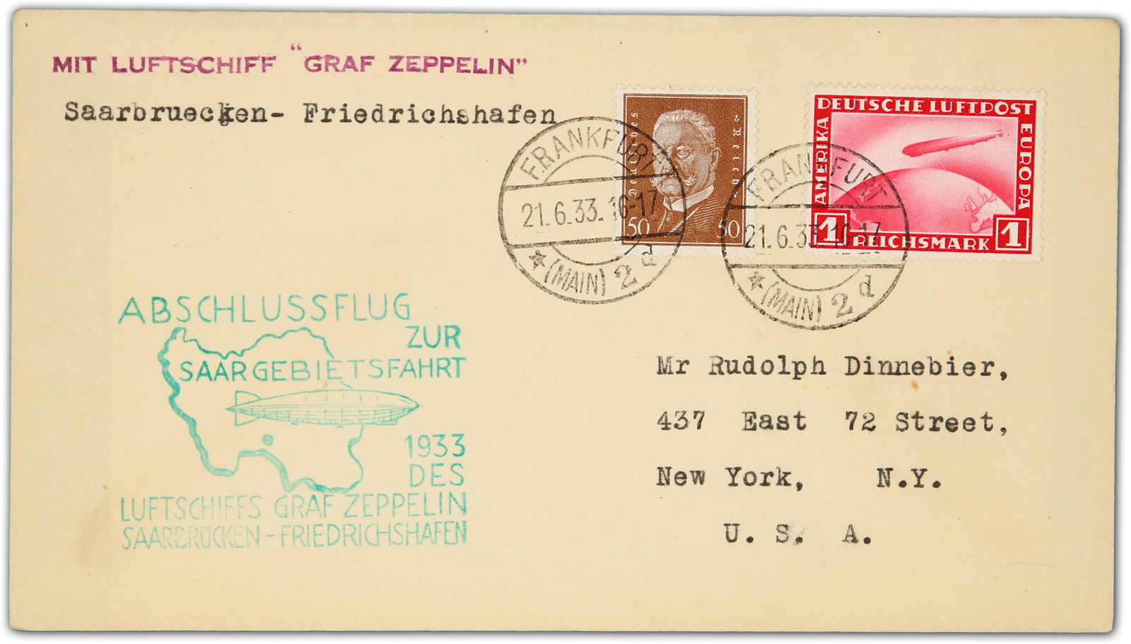 9651 Brief MichelZeppelinundLuftp image1933, Saargebietsfahrt, Rückfahrt, Brief Aufgabe Frankfurt 21.6.33 nach Friedrichshafen 25.6. adressiert nach New York (Image) (imagea)