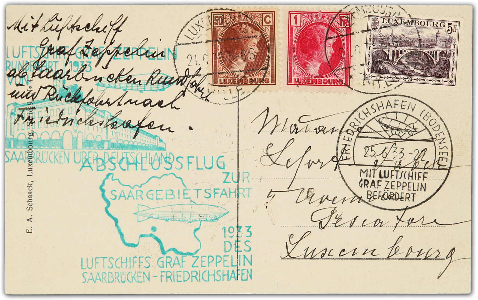 9650 Brief MichelZeppelinundLuftp image1933, Saargebietsfahrt, Zuleitungspost Luxemburg, Rückfahrt, Fotokarte ab Luxembourg 21.6.33 via Saarbrücken mit beiden grünen Bestätigungsstempeln nach Friedrichshafen 25.6. (Image) (imagea)