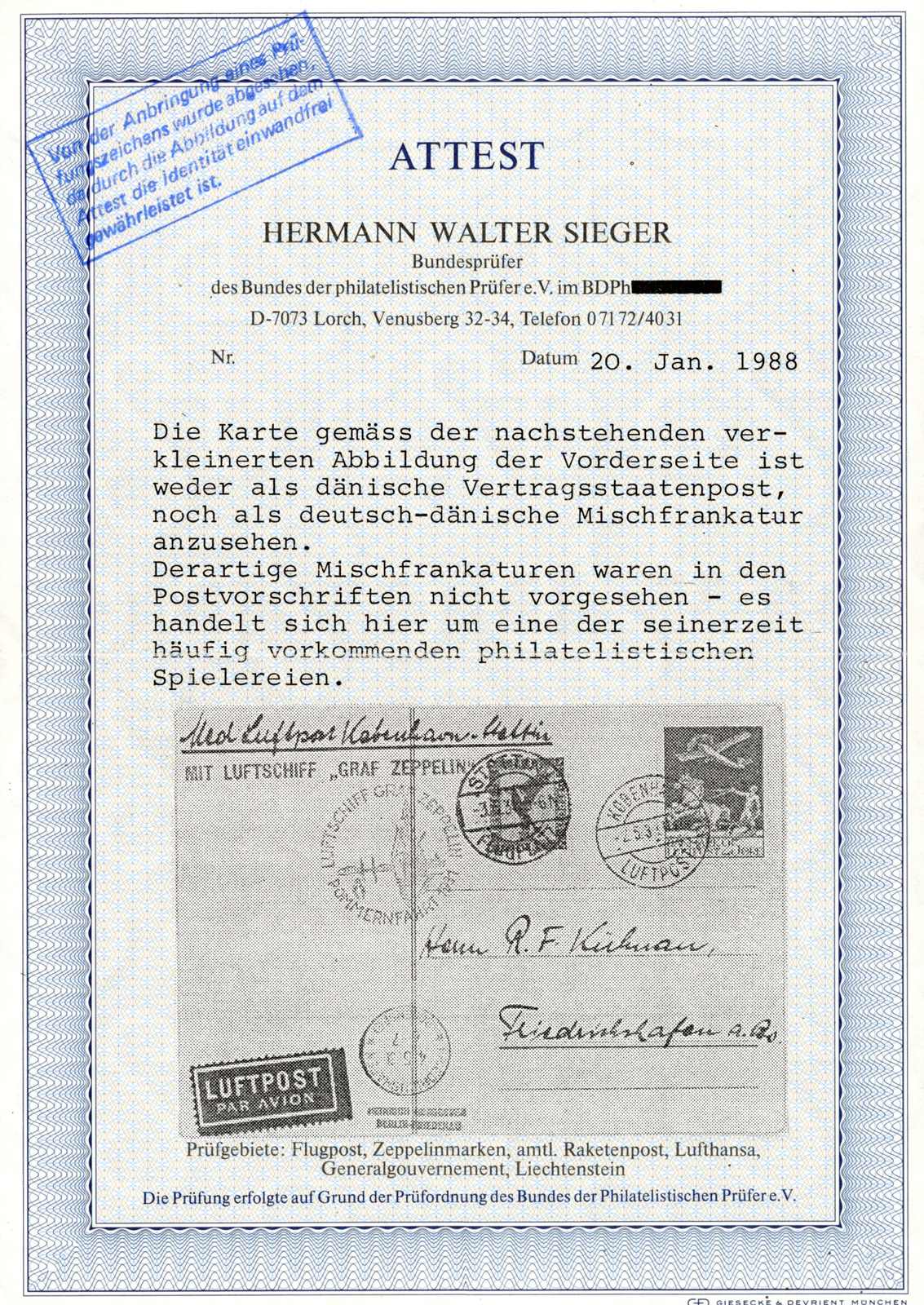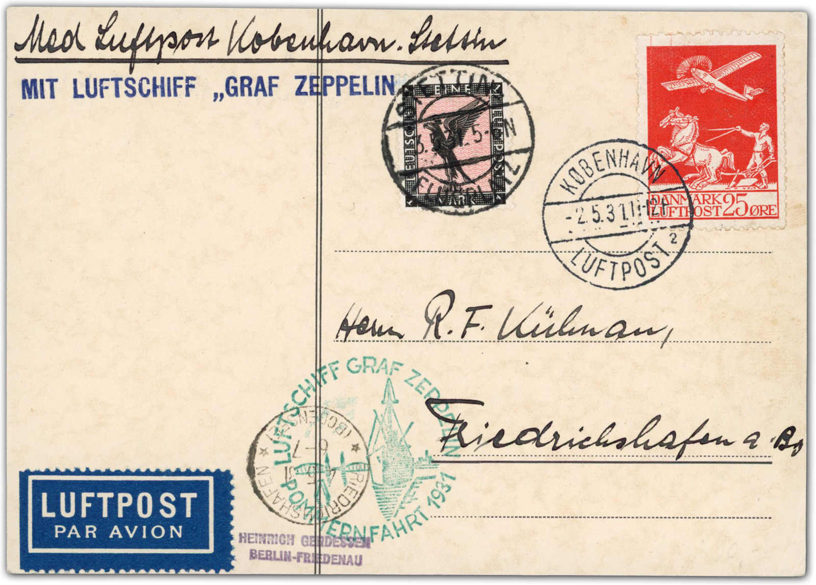 9646 Brief MichelZeppelinundLuftp image1931, Pommernfahrt, Rückfahrt, Karte ab Kopenhagen 2.5.31 via Stettin 3.5. nach Friedrichshafen 4.5., seltene Zweiländerfrankatur Dänemark/Deutsches Reich, Fotoattest Sieger BPP (Image) (imagea)