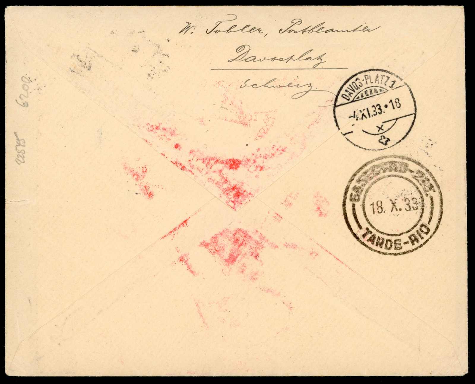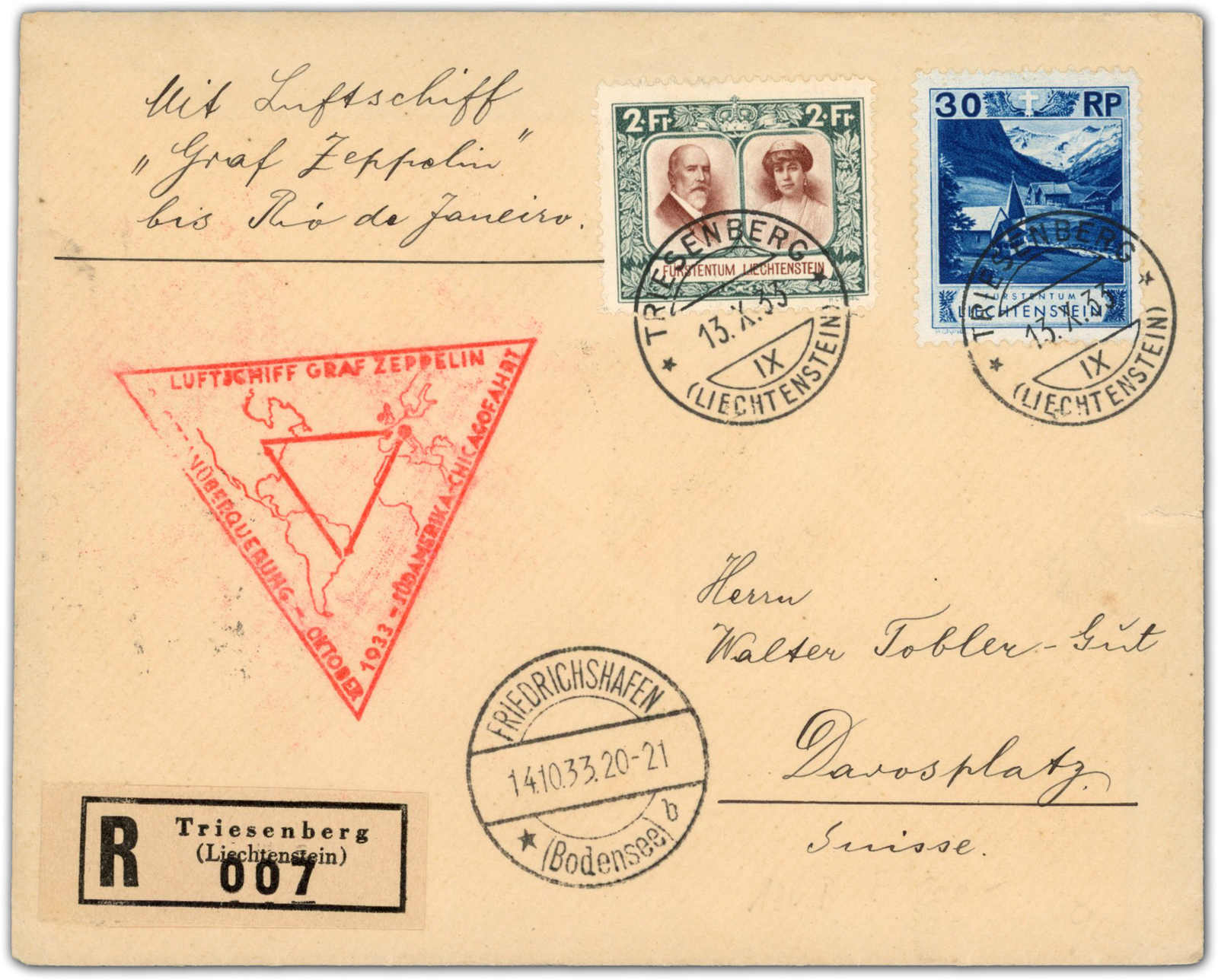 9657 Brief MichelZeppelinundLuftp image1933, Chicagofahrt, Zuleitungspost Liechtenstein, Etappe bis Rio de Janeiro, R-Brief ab Triesenberg 13.10.33 via Friedrichshafen 14.10. nach Rio de Janeiro 18.10. adressiert nach Davos-Platz 4.11. (Image) (imagea)